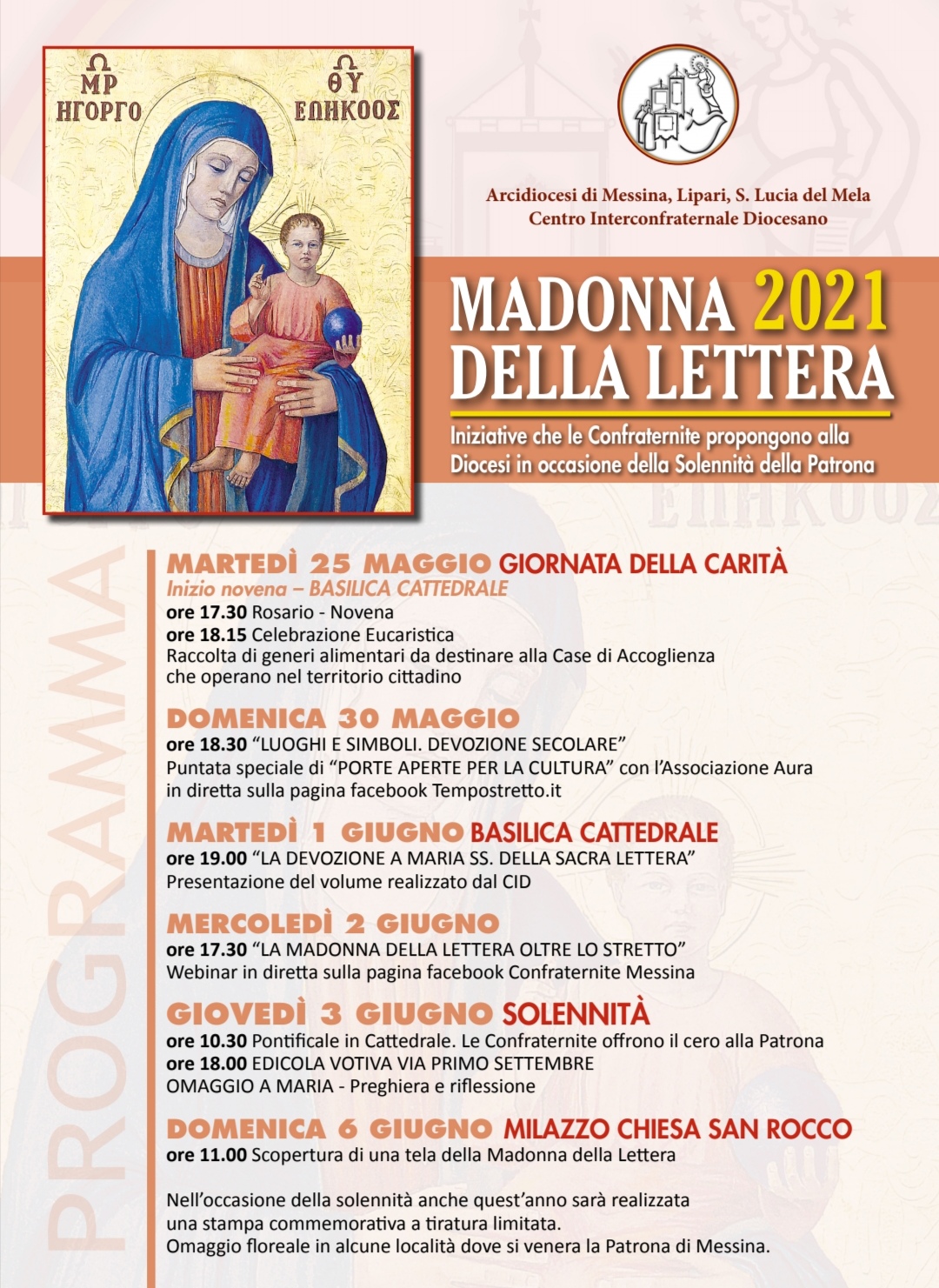 Tra gli eventi da segnalare anche la pubblicazione di “La devozione a Maria SS. della Sacra Lettera“, un volume realizzato dal Centro Interconfraternale Diocesano sulla secolare devozione a Santa Maria della Lettera. L’evento si terrà martedì 1 giugno alle ore 19.00 presso la Basilica Cattedrale di Messina.