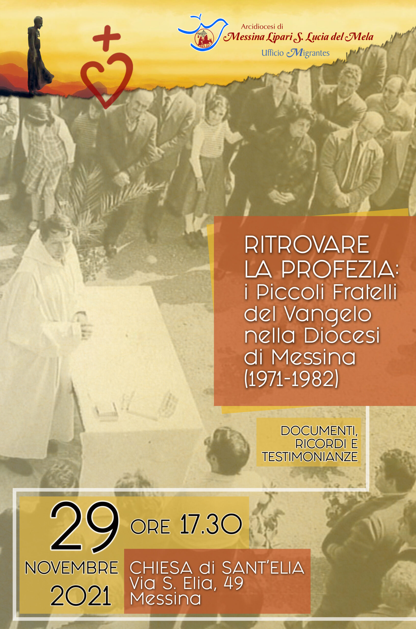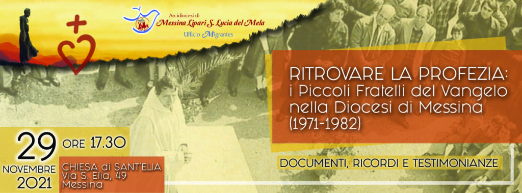 Lunedì 29 novembre 2021, alle ore 17.30, presso la Chiesa di Sant’Elia sita a Messina in Via S. Elia 45 – centro diocesano per la pastorale delle migrazioni – sarà ricordata, attraverso documenti e testimonianze, la presenza dei Piccoli Fratelli del Vangelo nella Diocesi di Messina. Una esperienza durata undici anni, dal 1971 al 1982, che ha lasciato un segno indelebile nella vita di quanti hanno avuto la possibilità di conoscere e partecipare alle feconde iniziative che ruotavano attorno alla fraternità che si era insediata a Milazzo. Una presenza che ha attratto tanti giovani per lo stile di vita povero condiviso con gli strati più umili della popolazione, per l’apostolato verso i diseredati, gli sfruttati e gli esclusi, per la prossimità negli ambienti meno penetrabili dalla “ordinaria” azione pastorale. Una fucina per chi, in quegli anni della contestazione alla società e alle istituzioni e della Chiesa che usciva dalla pagina straordinaria del Vaticano II, sentiva forte l’impegno per la tutela dei diritti civili, per l’attenzione al mondo del lavoro, al dialogo interreligioso, alla non violenza e alla pace.