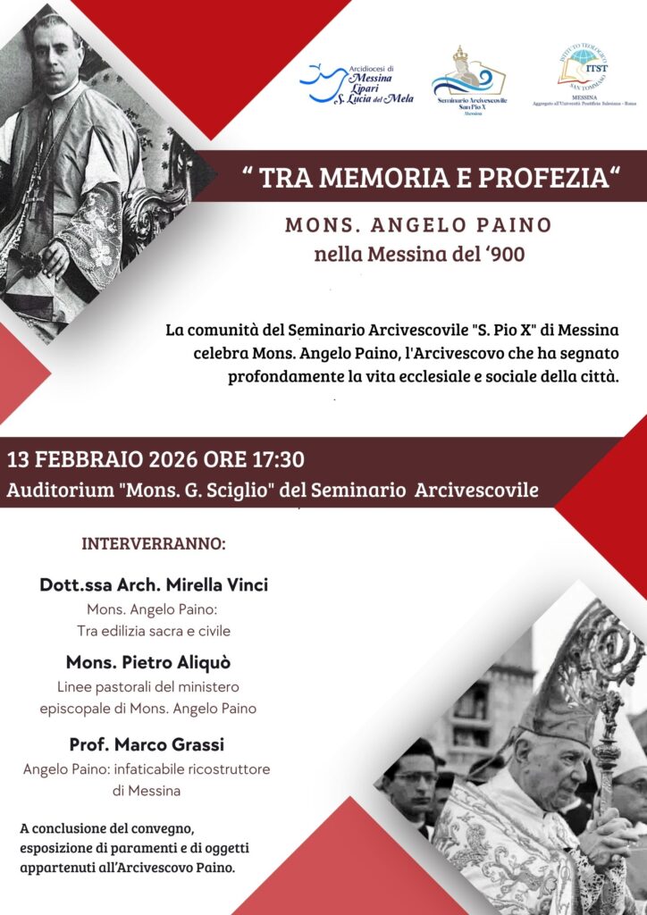 La comunità del Seminario Arcivescovile S. Pio X di Messina promuove il convegno “Tra memoria e profezia. Mons. Angelo Paino nella Messina del ’900”, in programma venerdì 13 febbraio 2026, alle ore 17.30, presso l’Auditorium “Mons. G. Sciglio” del Seminario Arcivescovile.