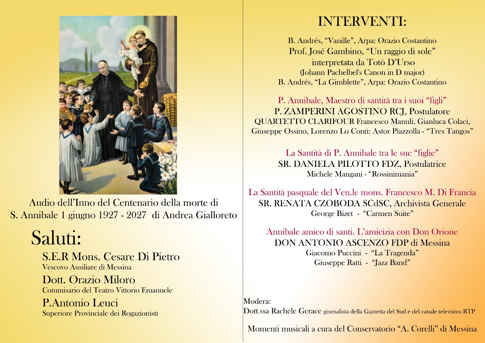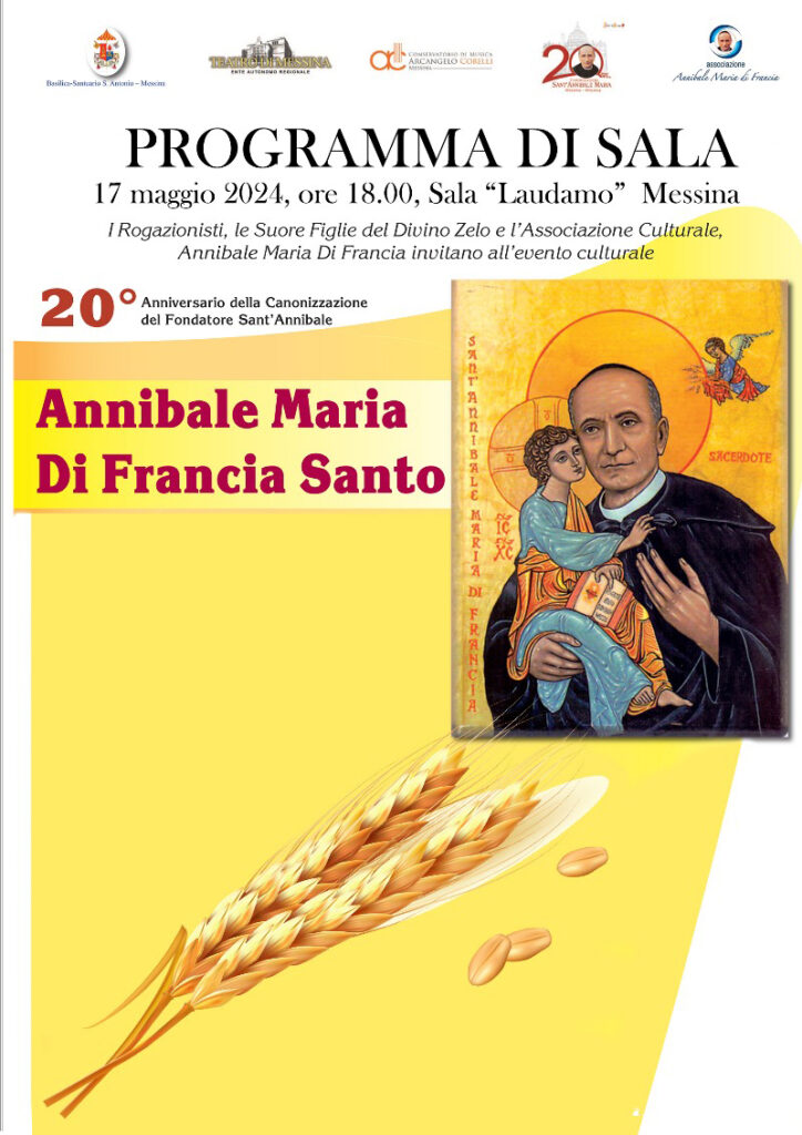 Presente il vescovo ausiliare mons. Cesare Di Pietro, venerdì 17 maggio 2024, alle ore 18.00, nella sala Laudamo, in occasione del ventesimo anniversario della canonizzazione di Sant’Annibale Maria Di Francia. Intervallati da interventi musicali, i relatori illustreranno la variegata e poliedrica figura del santo messinese, rilevando gli aspetti fondamentali del suo percorso di santità, i rapporti con altre figure illustri e quanto il suo carisma sia stato