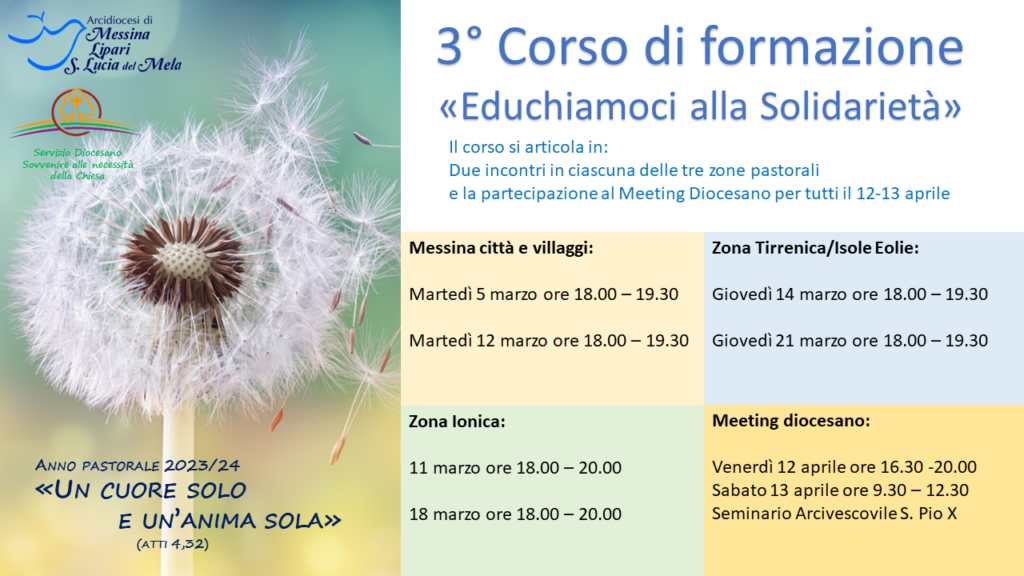 In continuità con gli anni precedenti sarà avviata a marzo la 3° edizione del Corso di Formazione “Educhiamoci alla Solidarietà” per la formazione di laici, presbiteri, religiosi/e, operatori pastorali. Il corso è articolato in due incontri su base zonale (Messina, Zona Tirrenica, Zona Ionica) nel mese di marzo e due incontri diocesani (per tutti) il 12 e 13 aprile 2024 al Seminario S. Pio X di Messina.