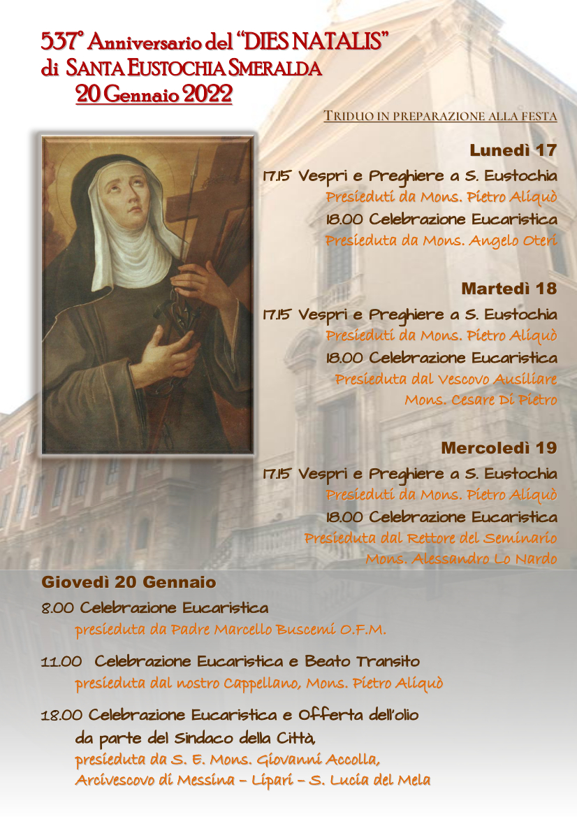 Con la celebrazione eucaristica di questa sera, presieduta da Mons. Angelo Oteri, ha avuto inizio il Triduo in preparazione alla Festa di Santa di S. Eustochia che culminerà giovedì 20 gennaio, giorno della Solennità, in cui la Città di Messina e la Comunità diocesana ricorderanno la fondatrice e prima badessa del Monastero di Montevergine, Eustochia Smeralda Calafato (25 marzo 1434 – 20 gennaio 1485) la quale «si dedicò con grande ardore a ripristinare l’antica disciplina della vita religiosa e a promuovere la sequela di Cristo sul modello di san Francesco». Alle ore 18 avrà luogo il Solenne Pontificale presieduto dall’Arcivescovo Mons. Giovanni Accolla nel corso del quale sarà offerto alla Santa l’olio da parte del Sindaco della Città.
