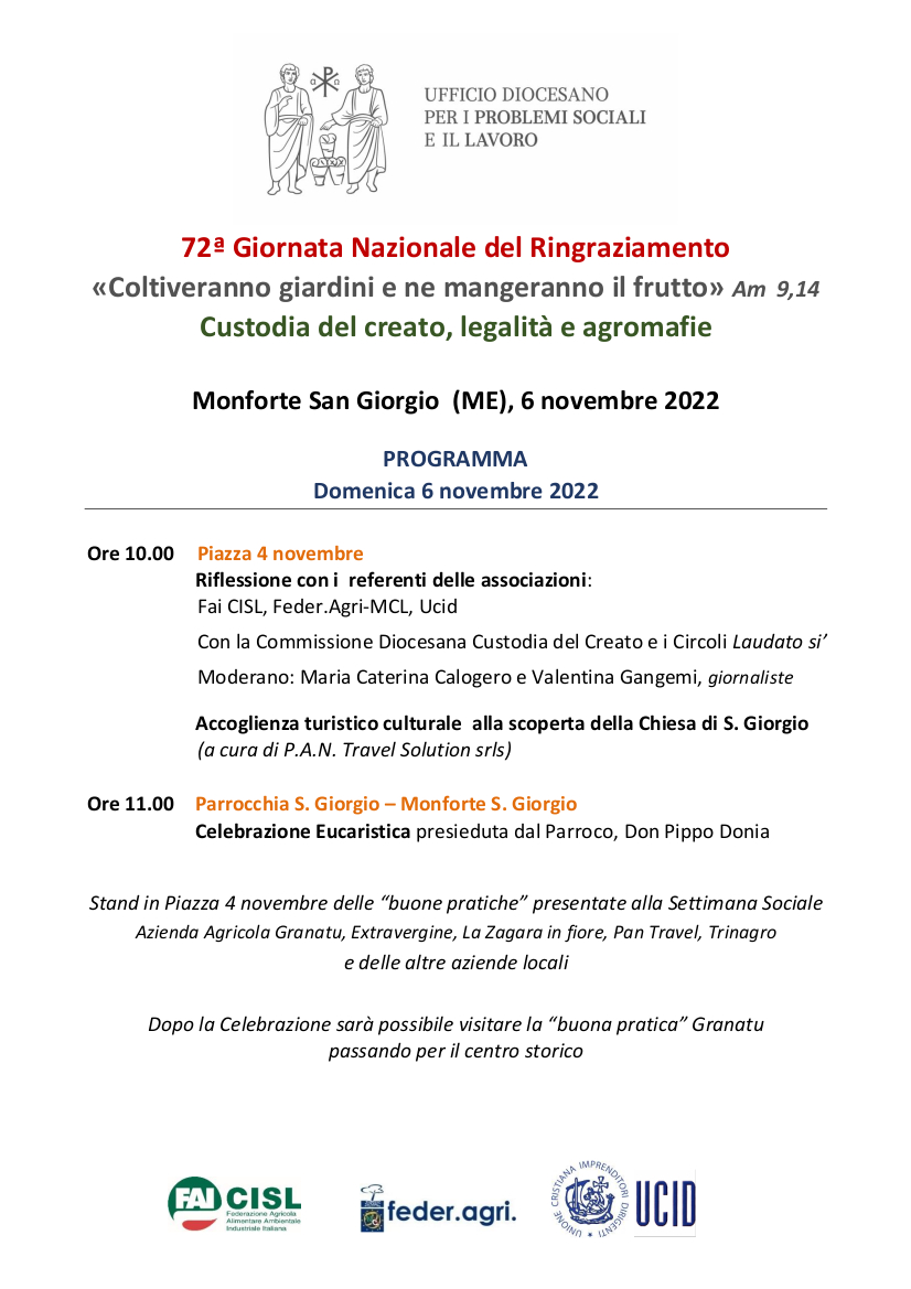 A livello diocesano la Giornata si terrà nella Parrocchia S. Giorgio sita in Monforte San Giorgio (ME). Sarà un momento importante di preghiera e fraternità che coinvolgerà la nostra Arcidiocesi di Messina – Lipari – S. Lucia del Mela. Domenica 6 novembre alle ore 11,00 verrà celebrata la S. Messa presieduta dal parroco Don Pippo Donia.