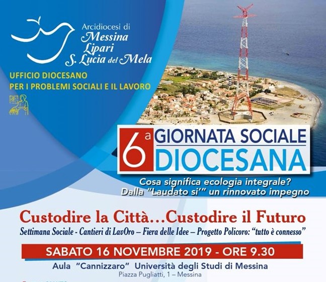 Sabato 16 Novembre 2019 alle ore 9,30 presso l’Aula “Cannizzaro” dell’Università degli Studi di Messina (Piazza Pugliatti, 1 – Messina), si terrà la 6a GIORNATA SOCIALE DIOCESANA dal titolo “Custodire la Città…Custodire il Futuro”all’inizio del cammino organizzato per questo anno pastorale dall’Ufficio per i problemi sociali e il lavoro. Ci chiederemo cosa significhi ecologia integrale e quale rinnovato impegno desumiamo dalla “Laudato si’”. Vedremo come la Settimana Sociale, i Cantieri di LavOro, la Fiera delle Idee ed il Progetto Policoro sono tutte iniziative della nostra Chiesa collegate e al servizio dei giovani e dello sviluppo del nostro territorio perché il Vangelo è luce per la nostra società.