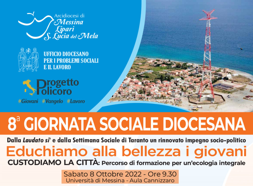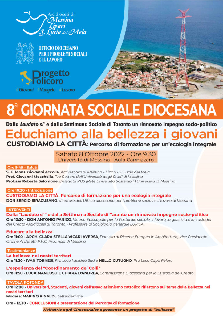 A conclusione del “Tempo del Creato” la nostra Arcidiocesi organizza Sabato 8 ottobre 2022 alle ore 9,30 presso l’Aula “Cannizzaro” dell’Università degli Studi di Messina (Piazza Pugliatti, 1) l’8a GIORNATA SOCIALE DIOCESANA dal titolo “EDUCHIAMO ALLA BELLEZZA I GIOVANI”. Dalla “Laudato si’” e dalla Settimana Sociale di Taranto un rinnovato impegno socio-politico. Sarà presentata la seconda edizione del Percorso di formazione per una ecologia integrale: CUSTODIAMO LA CITTÀ.