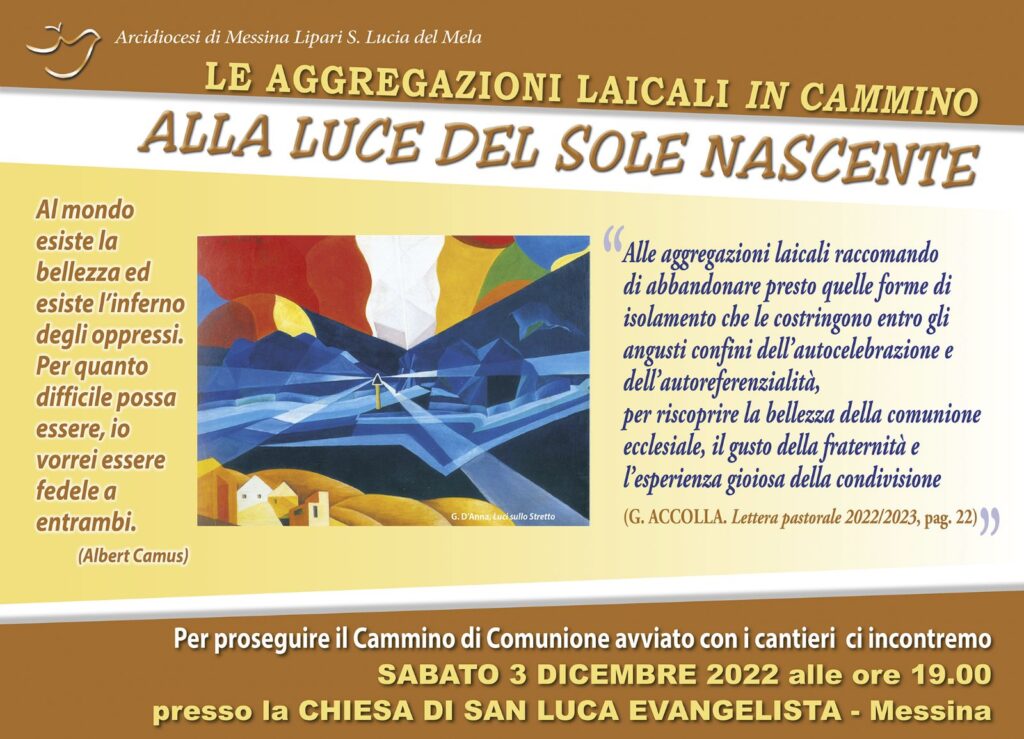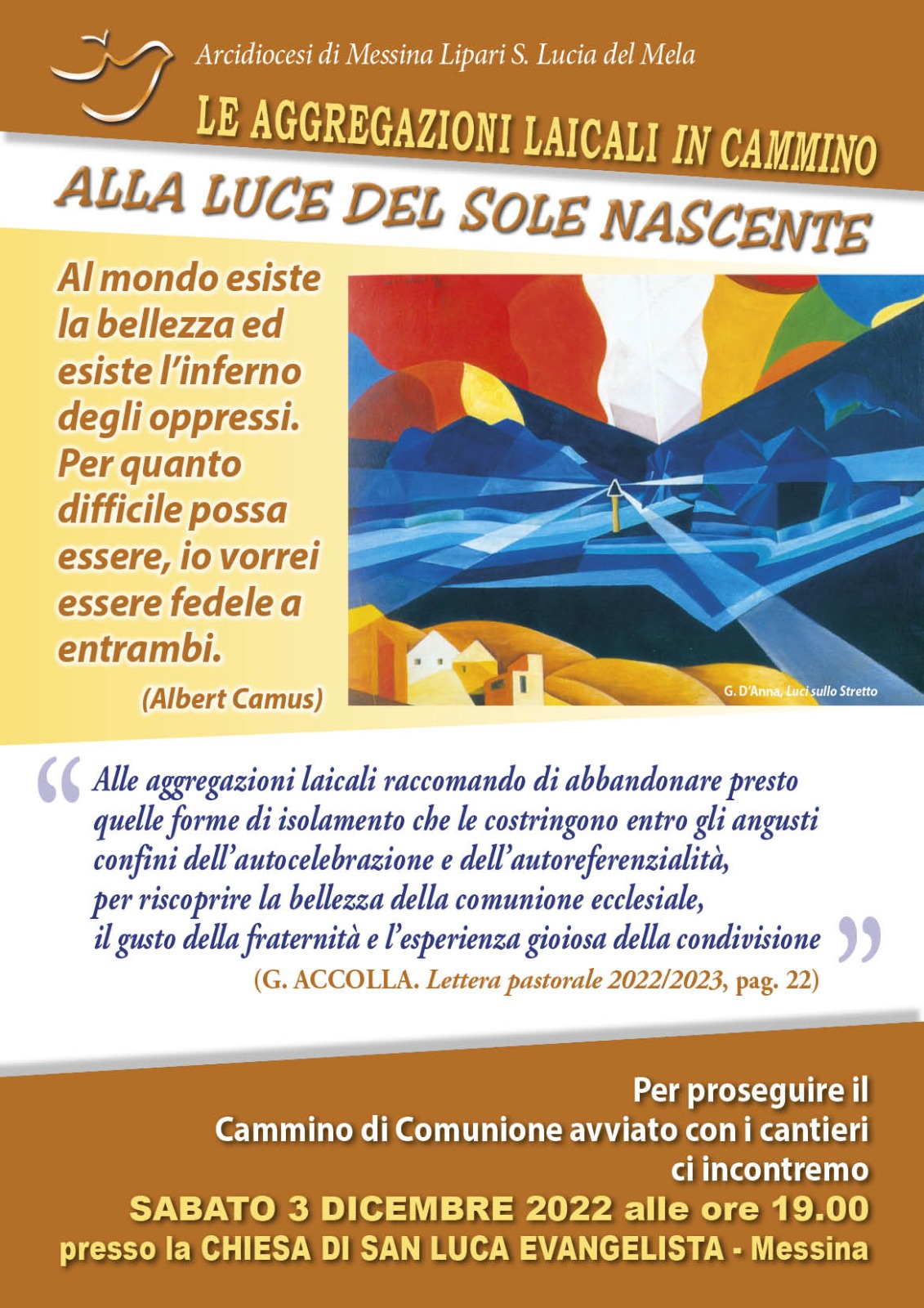 Guidati dalla lettera pastorale 2022-2023 del nostro Arcivescovo: “È appena l’aurora: ma come già toccano soavemente i nostri animi i primi raggi del sole sorgente” (Giovanni XXIII), iniziamo il nuovo anno Pastorale. Ci incontreremo sabato 3 dicembre alle ore 19, presso la Chiesa di San Luca.