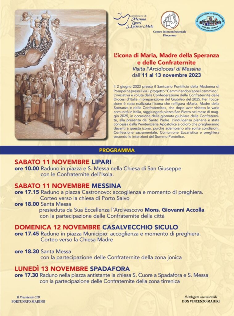 L’iniziativa è voluta dalla Confederazione delle Confraternite delle Diocesi d’Italia in preparazione del Giubileo del 2025. Per l’occasione è stata realizzata l’icona che raffigura “Maria, Madre della Speranza e delle Confraternite”, che dopo aver visitato le varie comunità in Italia, raggiungerà piazza San Pietro nel mese di maggio 2025, in occasione della giornata giubilare delle Confraternite, alla presenza del Santo Padre. L’indulgenza plenaria è stata concessa dalla Penitenzeria Apostolica a coloro che pregheranno davanti a questa icona, purché adempiano alle solite condizioni: Confessione sacramentale, Comunione Eucaristica e preghiera secondo le intenzioni del Sommo Pontefice.