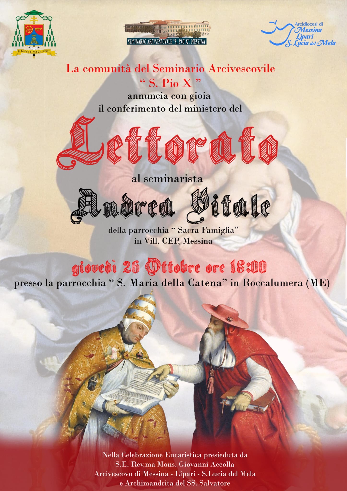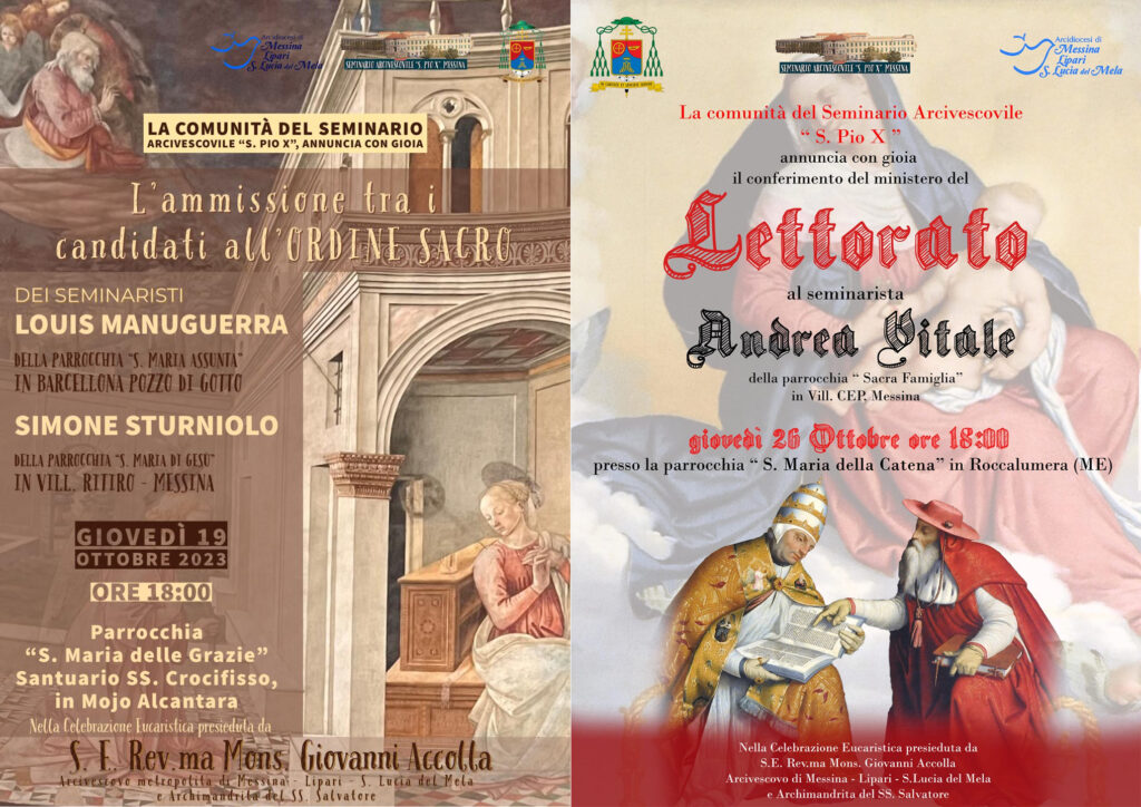 - il seminarista Andrea Vitale, della parrocchia “S. Famiglia” in vill. Cep sarà istituito lettore da S.E. Mons. Giovanni Accolla nella Santa Messa che sarà celebrata il 26 ottobre 2023 alle ore 18,00 nella chiesa “S. Maria della Catena” in Roccalumera (ME).