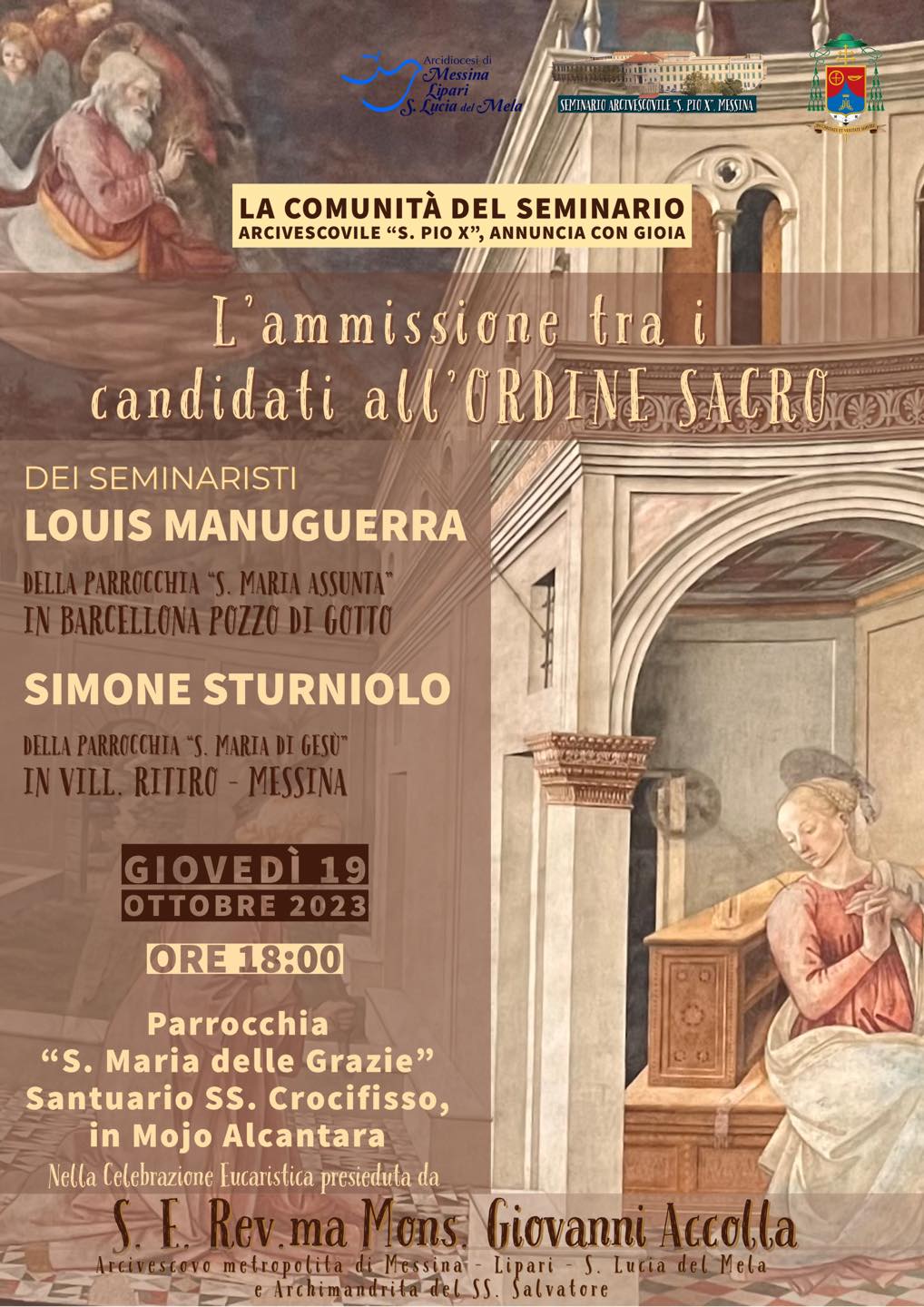 - i seminaristi Louis Manoguerra, della parrocchia “S. Maria Assunta” in Barcellona P.G., e Simone Sturniolo, della parrocchia “S. Maria di Gesù” in vill. Ritiro, saranno ammessi tra i candidati all’Ordine Sacro da S.E. Mons. Giovanni Accolla nella Santa Messa che sarà celebrata il 19 ottobre 2023 alle ore 18,00 nella chiesa “S. Maria delle Grazie” in Mojo Alcantara (ME)
