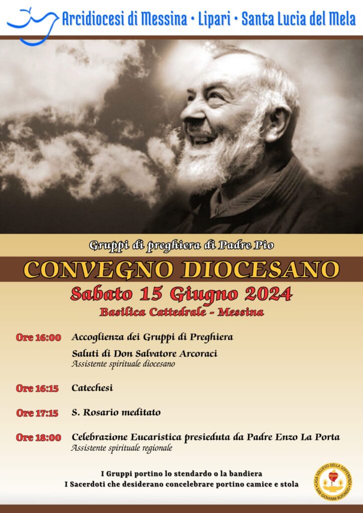 Sabato 15 giugno 2024, nella Basilica Cattedrale di Messina, si svolgerà l’annuale Convegno diocesano dei Gruppi di preghiera di Padre Pio con il seguente programma: