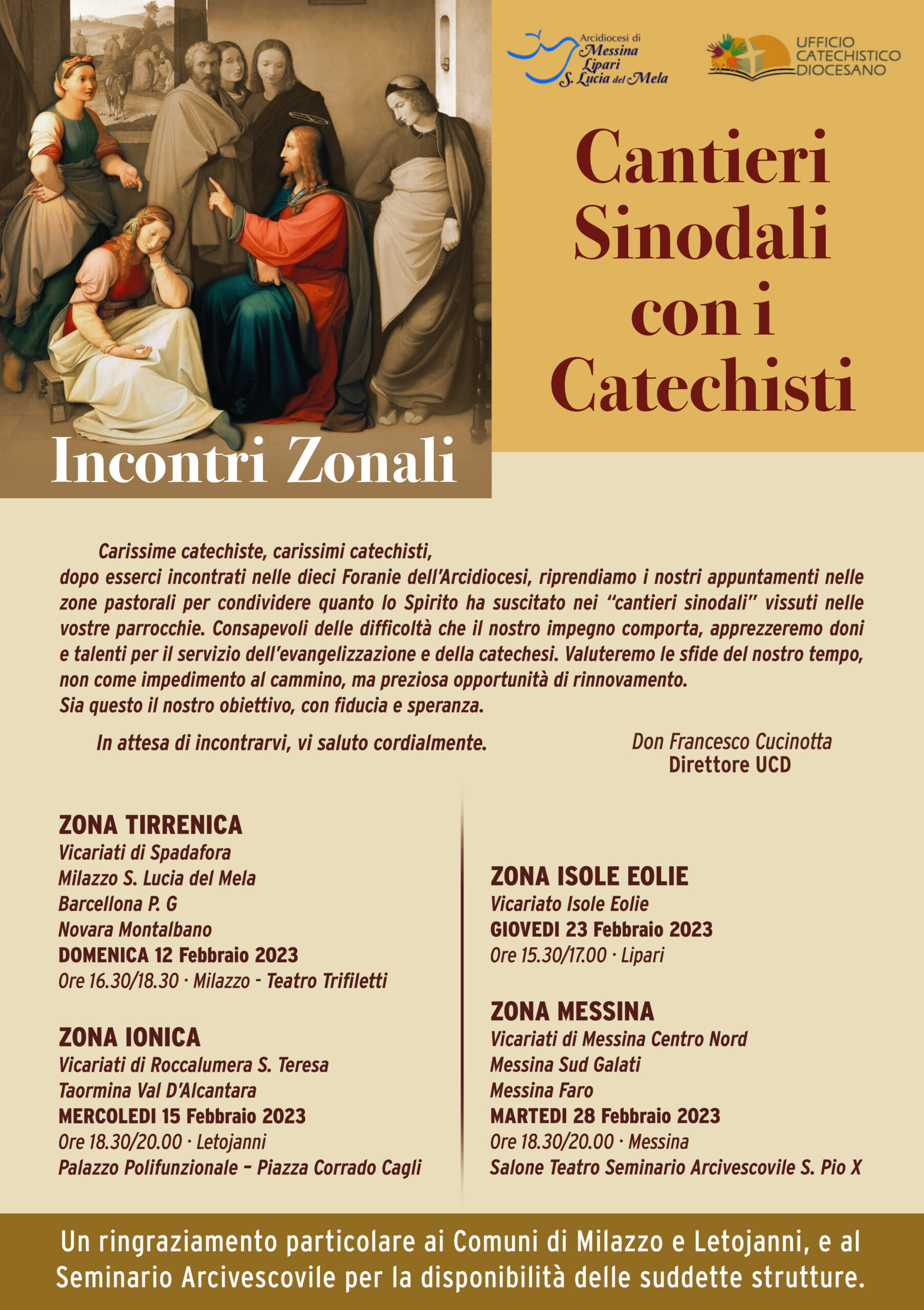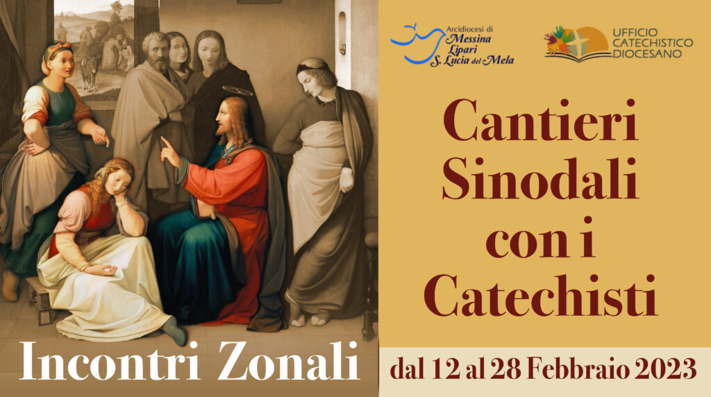 L’Ufficio Catechistico diocesano, dopo aver incontrato nelle dieci Foranie i catechisti e le catechiste dell’Arcidiocesi, riprende, dal 12 al 28 febbraio p.v., gli appuntamenti nelle zone pastorali per condividere quanto lo Spirito ha suscitato nei “cantieri sinodali con i catechisti” vissuti nelle parrocchie.
