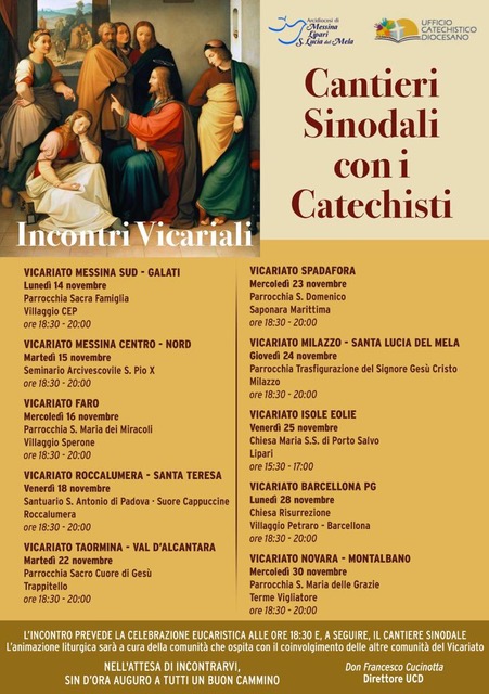 NewsUfficio Catechistico DiocesanoCantieri Sinodali con i Catechisti Dal 14 al 30 Novembre p.v. l’Ufficio Catechistico Diocesano incontra i Catechisti nei diversi Vicariati. Il cammino di quest’anno sarà incentrato sulla scelta “SINODALE”. In Allegato, il calendario degli incontri. condividi su 12 Novembre 202212 Novembre 2022