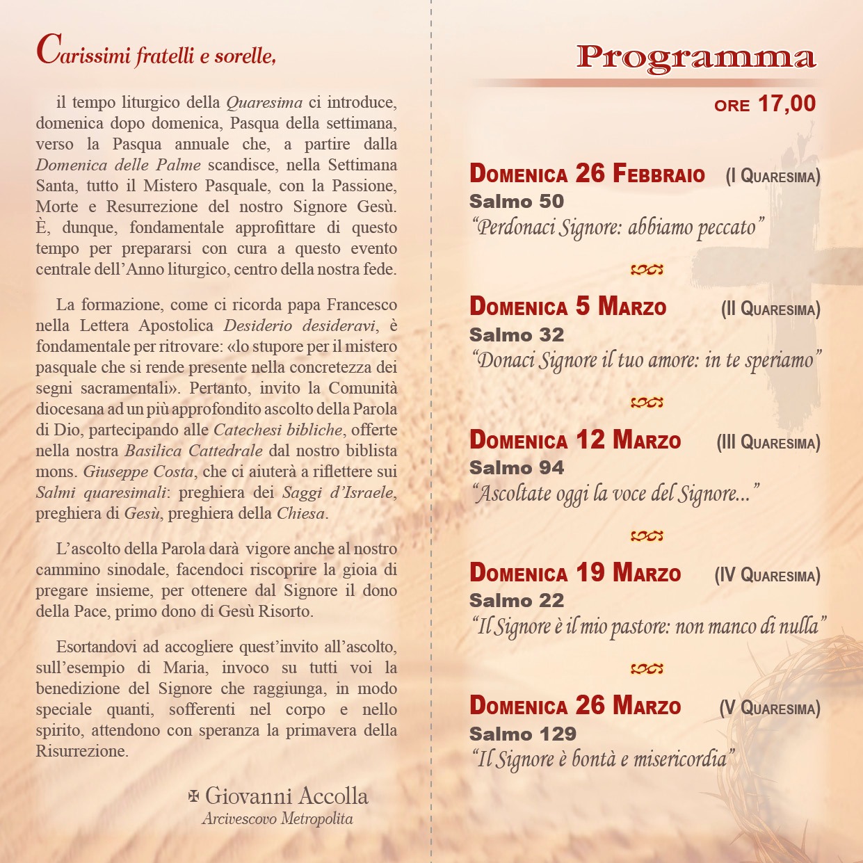 Come di consueto, l’appuntamento è introdotto dal nostro Arcivescovo Mons. Giovanni Accolla, il quale ci invita sottolineando come il tempo liturgico della Quaresima ci introduce domenica dopo domenica, Pasqua settimanale, verso la Pasqua annuale, aperta dalla Domenica delle Palme e che ha come culmine il Triduo pasquale, con la Passione, Morte e Risurrezione del nostro Signore Gesù Cristo. Alla luce di questo, le catechesi di Mons. Costa permettono di entrare sempre più nel Mistero della Pasqua, attraverso i Salmi quaresimali: preghiera dei Saggi d’Israele, preghiera di Gesù e preghiera della Chiesa.