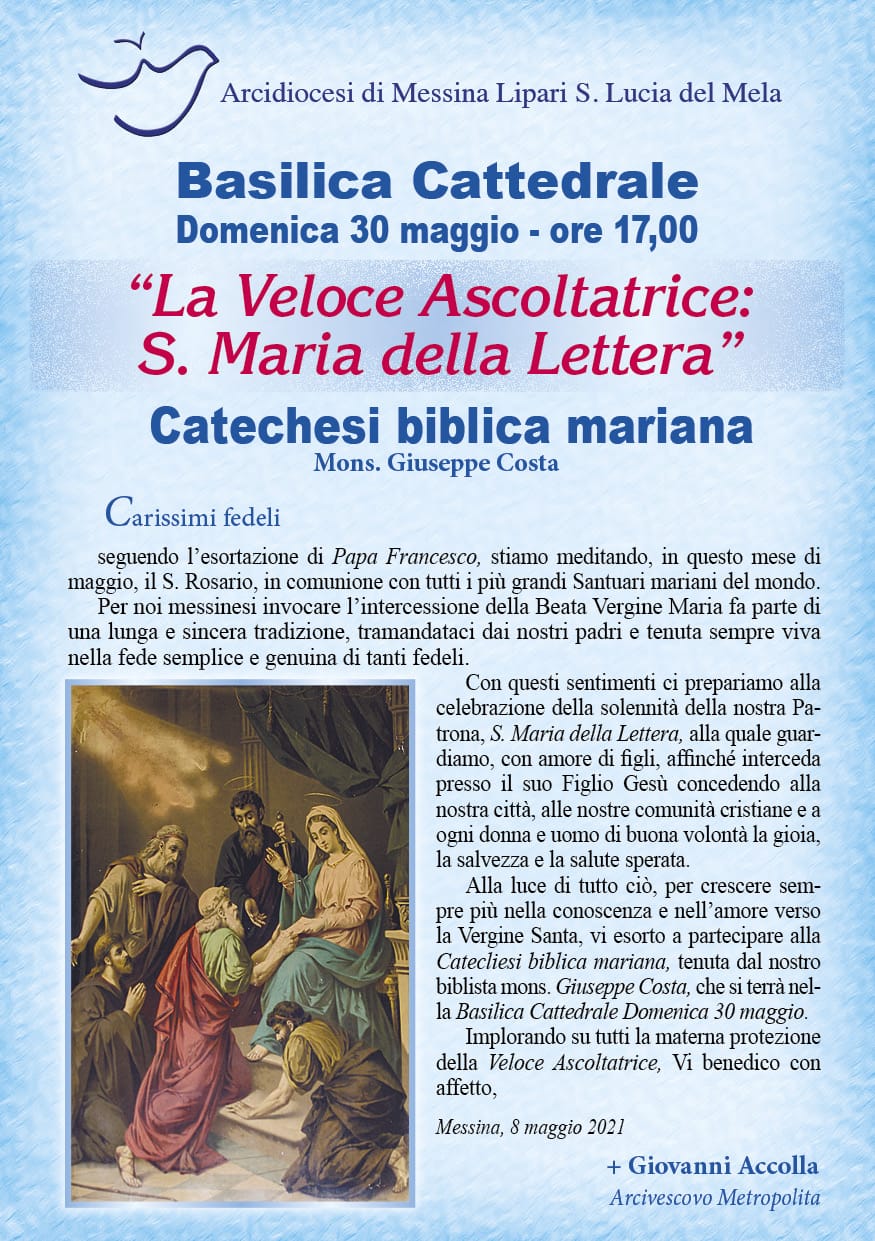Alla luce di questo, siamo tutti esortati a partecipare, Domenica 30 maggio 2021 alle ore 17,30, alla catechesi biblica mariana offerta dal biblista Mons. Giuseppe Costa, la cui riflessione ha come titolo “La Veloce Ascoltatrice: S. Maria della Lettera“.