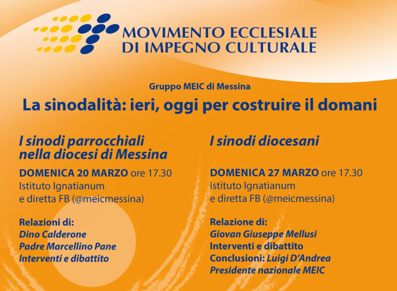 Il MEIC di Messina ha organizzato un ciclo di incontri sul tema “La sinodalità: ieri, oggi per costruire il domani”. Il primo di questi incontri, su “I sinodi parrocchiali nella diocesi di Messina”, si terrà domenica 20 marzo p.v., alle ore 17.30, presso l’Istituto Ignatianum e verrà trasmesso in diretta facebook sulla pagina del Movimento […]