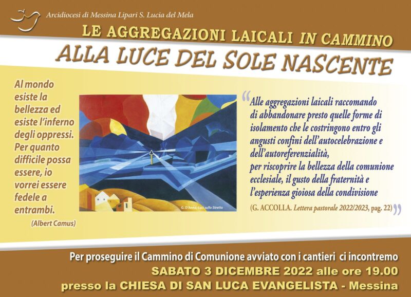 Guidati dalla lettera pastorale 2022-2023 del nostro Arcivescovo: “È appena l’aurora: ma come già toccano soavemente i nostri animi i primi raggi del sole sorgente” (Giovanni XXIII), iniziamo il nuovo anno Pastorale. Ci incontreremo sabato 3 dicembre alle ore 19, presso la Chiesa di San Luca. Qui di seguito alcuni stralci che riguardano le aggregazioni laicali. […]