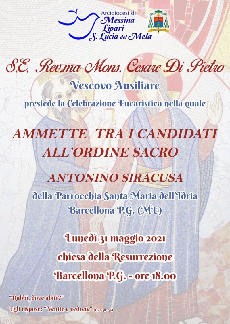 Nella celebrazione eucaristica di lunedì 31 maggio 2021, che si terrà alle ore 18.00, presso la Chiesa della Resurrezione in Barcellona P.G., Sua Eccellenza Rev.ma Mons. Cesare Di Pietro, Vescovo Ausiliare della nostra Arcidiocesi, ammetterà tra i candidati all’Ordine sacro Antonino Siracusa della Parrocchia Santa Maria dell’Idria in Barcellona P.G (Me). Accompagniamo questo nostro fratello […]