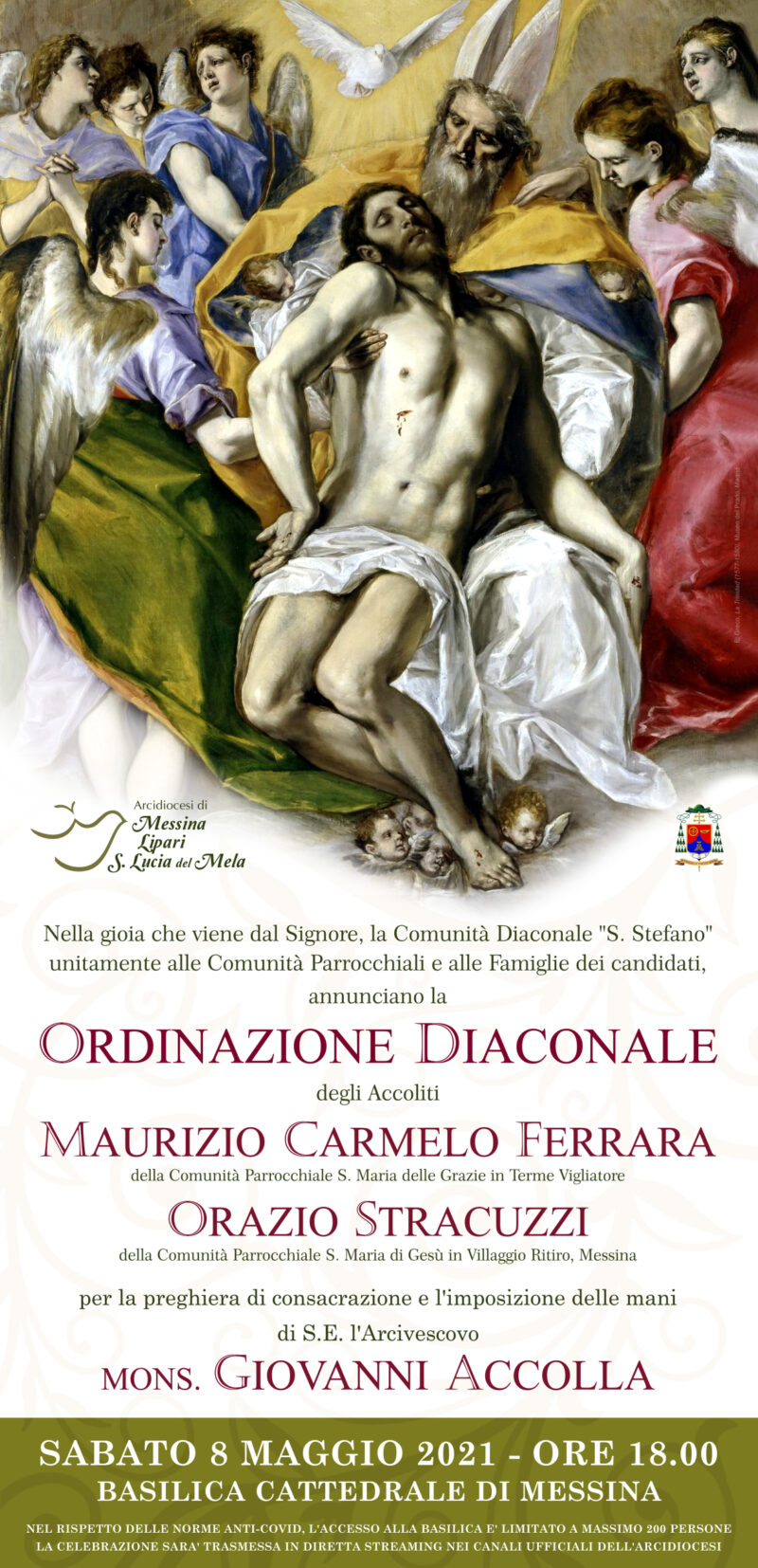 L’Arcidiocesi annuncia con gioia il Conferimento dei Ministeri ai Candidati al Diaconato. Nella celebrazione eucaristica di Giovedì 8 aprile 2021, alle ore 18.00, presso la Basilica Cattedrale di Messina, il nostro Arcivescovo S.E. Rev.ma Mons. Giovanni Accolla istituirà LETTORI Cosimo Baviera e Giuseppe De Francesco e ACCOLITI Giuseppe Alibrandi, Antonino Fazio e Paolo Orifici. Sosteniamo […]