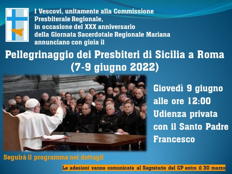 Si è svolto il 15 febbraio scorso presso l’Oasi Francescana di Pergusa (EN) l’incontro straordinario della Commissione Presbiterale Siciliana (CPS) presieduta dal vescovo delegato per il clero S.E. Mons. Guglielmo Giombanco. Unico argomento all’ordine del giorno l’organizzazione del pellegrinaggio regionale dei presbiteri di Sicilia a Roma previsto nei giorni 7-9 giugno in occasione del XXX […]