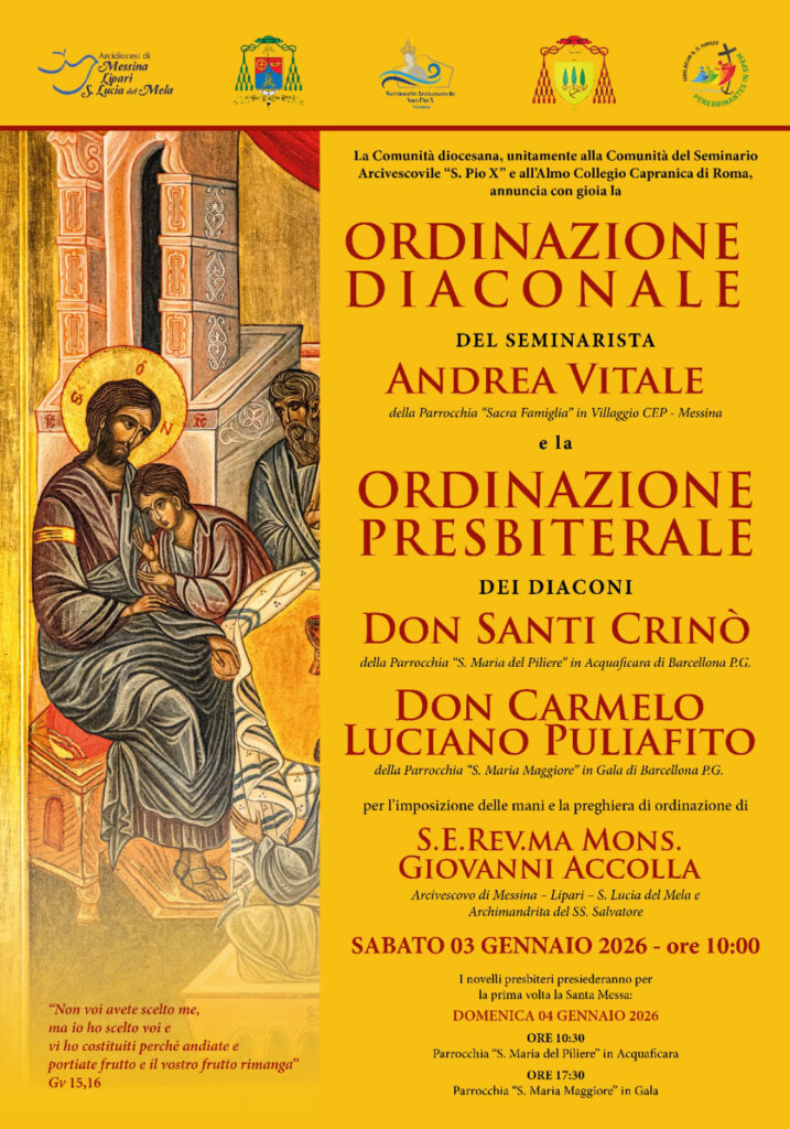 La Comunità Diocesana, unitamente alla comunità del Seminario Arcivescovile S. Pio X, all’Almo Collegio Capranica e alle famiglie, annuncia con gioia l’Ordinazione Diaconale del Seminarista Andrea Vitale della Parrocchia “S. Famiglia” in vill. CEP – Messina e l’Ordinazione Presbiterale dei diaconi Santi Crinò della Parrocchia “S. Maria del Piliere” in Acquaficara – Barcellona P.G. e […]