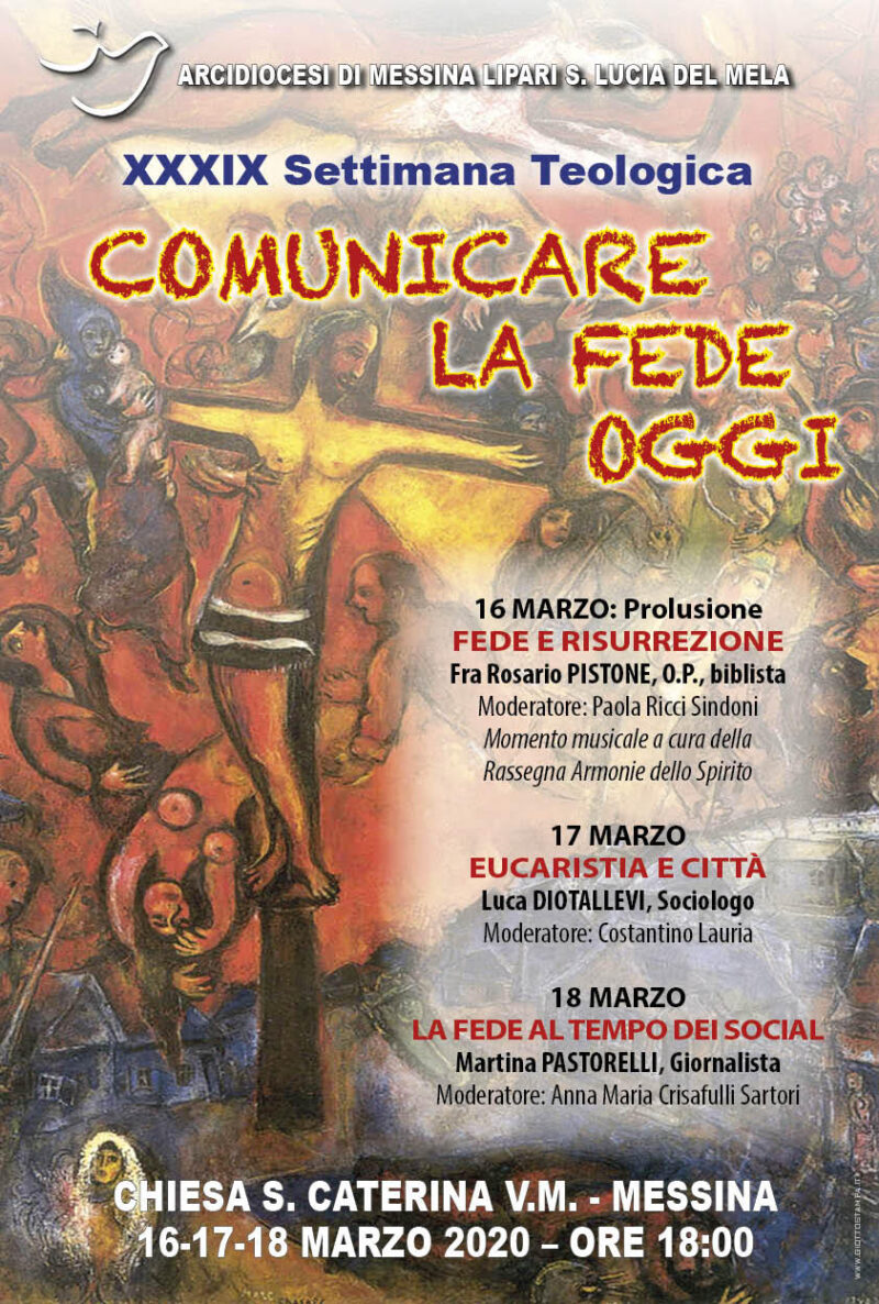 Locandina Programma Brochure Si rinnova l’appuntamento annuale di formazione e riflessione della “Settimana Teologica”. Il tema che si tratterà in questo 2019 sarà “Vivere la gioia nelle prove”. Le tre serate si svolgeranno nella parrocchia Santa Caterina V. e M. in Messina e avranno come relatori: nella prima serata il Prof Giovanni Cesare PAGAZZI, docente […]