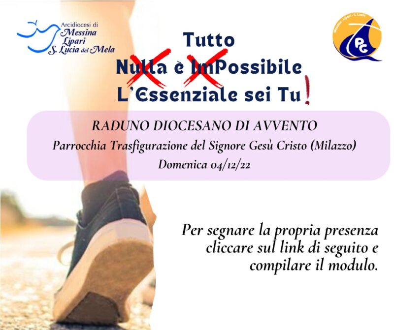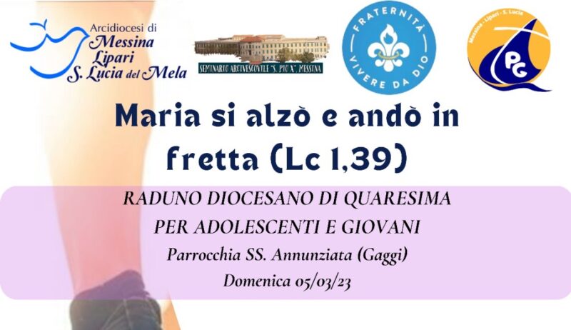 Nella seconda Domenica di Quaresima, il 25 febbraio, si terrà il Raduno diocesano dei giovani nella Parrocchia S. Maria Annunziata e Assunta in Forza d’Agrò. Momento di incontro, fraternità, preghiera dei nostri giovani insieme all’Arcivescovo. Il tema della giornata, tenuto da fra Antonino Catalfamo ofm, sarà “Trasfigurati dall’Amore… trasfigurati per amare”. Per iscrivere il proprio […]