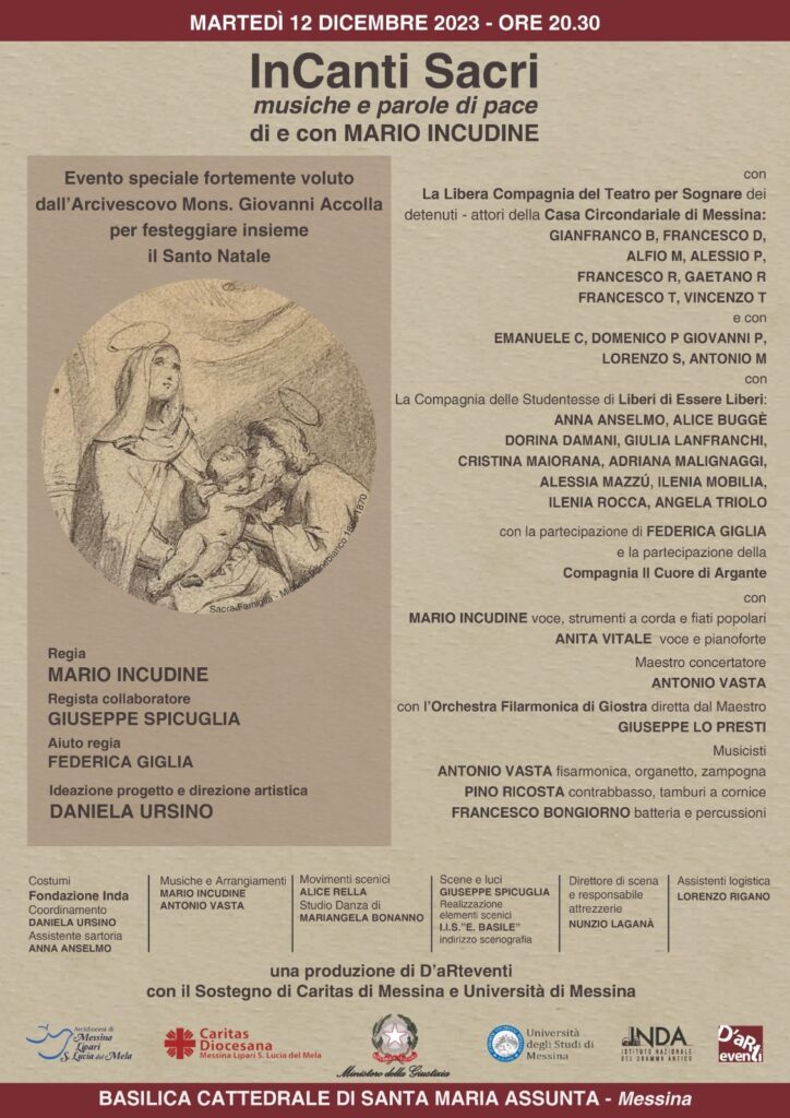 Sabato 9 dicembre alle ore 10.00, nel salone di rappresentanza del palazzo arcivescovile (ingresso via Garibaldi) si terrà la conferenza stampa per la presentazione del Concerto-Spettacolo “InCanti Sacri – musiche e parole di pace”, di e con Mario Incudine.