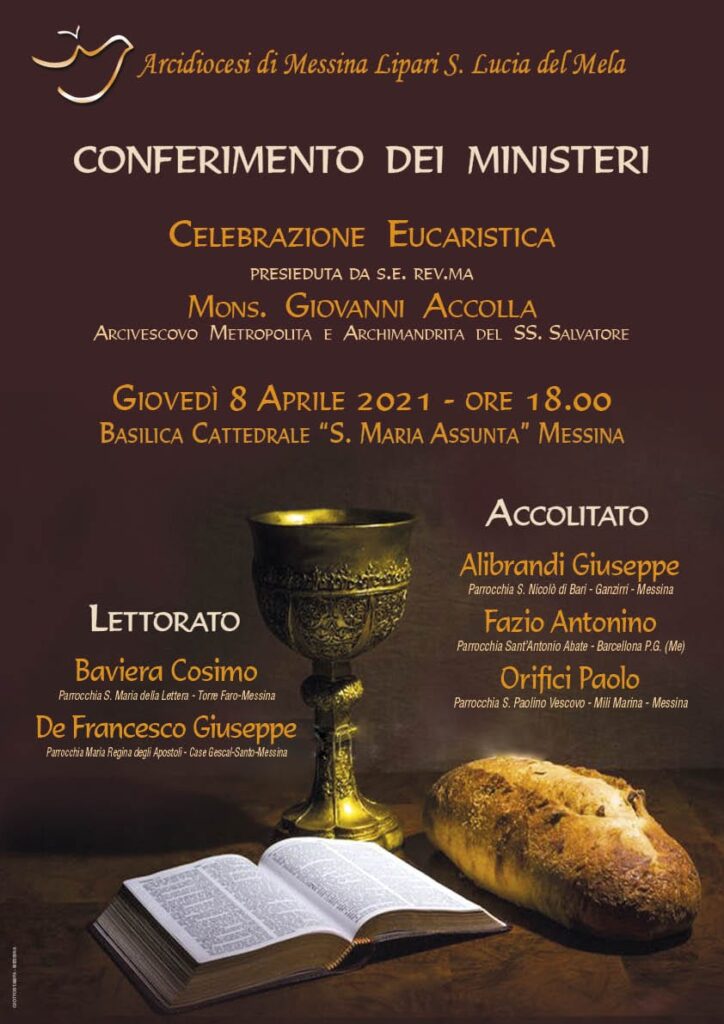 Nella celebrazione eucaristica di Giovedì 8 aprile 2021, alle ore 18.00, presso la Basilica Cattedrale di Messina, il nostro Arcivescovo S.E. Rev.ma Mons. Giovanni Accolla istituirà LETTORI Cosimo Baviera e Giuseppe De Francesco e ACCOLITI Giuseppe Alibrandi, Antonino Fazio e Paolo Orifici.