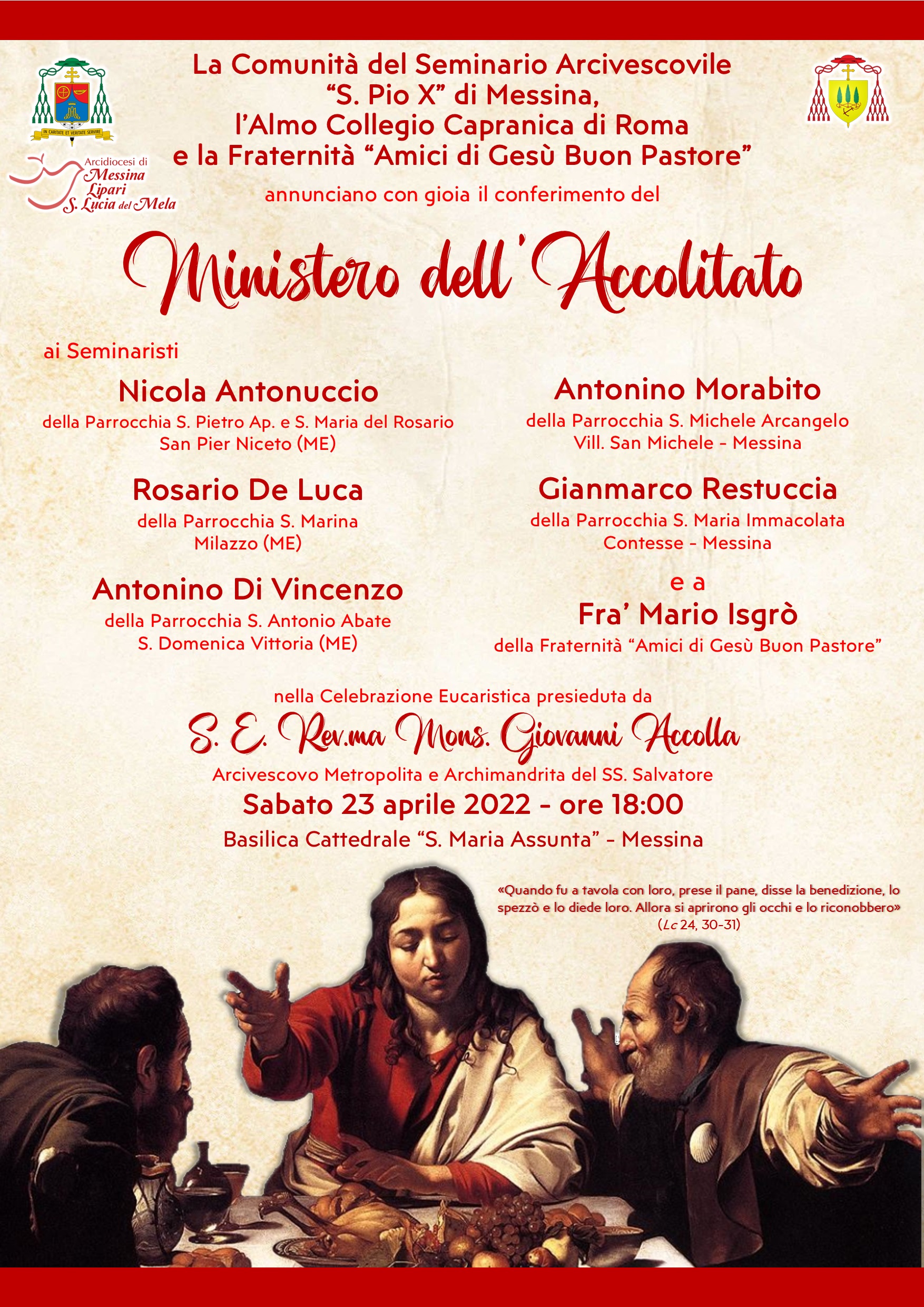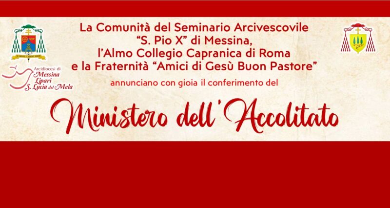 Il Seminario Arcivescovile “S. Pio X” di Messina, l’Almo Collegio Capranica di Roma e la Fraternità “Amici di Gesù Buon Pastore”, annunciano con gioia il conferimento del Ministero dell’Accolitato ai Seminaristi Nicola Antonuccio, Rosario De Luca, Antonino Di Vincenzo, Antonino Morabito, Gianmarco Restuccia e a Fra Mario Isgrò nella Celebrazione Eucaristica presieduta da S.E. l’Arcivescovo Mons. Giovanni Accolla, che avrà luogo Sabato 23 aprile 2022 alle ore 18.00 nella Basilica Cattedrale “S. Maria Assunta” di Messina (consulta la locandina). Li accompagniamo con la preghiera.