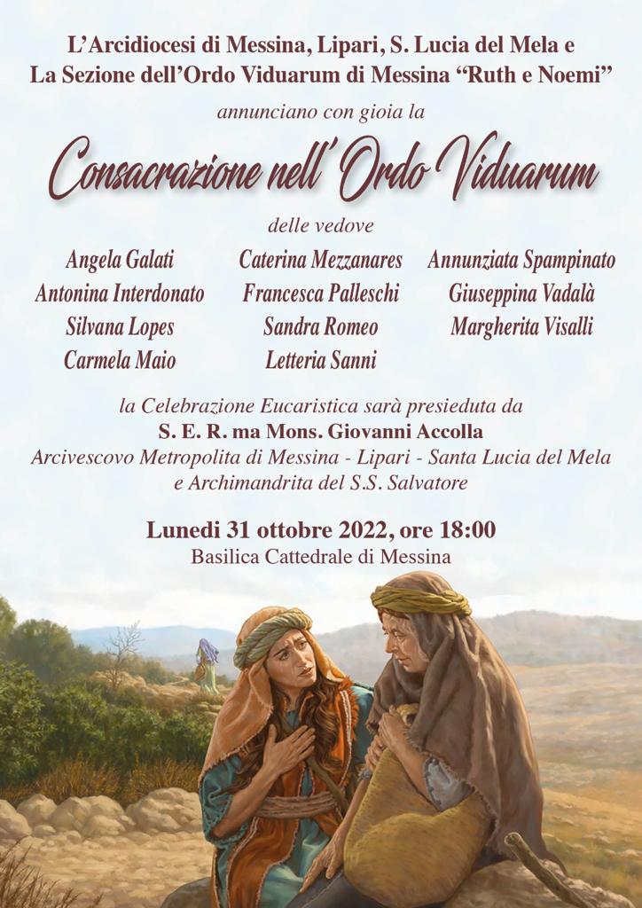 Lunedì 31 ottobre, alle ore 18.00, nella S. Messa presieduta da S.E.R..ma Mons. Giovanni Accolla, nella Basilica Cattedrale, verranno benedette nell’Ordo Viduarum undici vedove di varie Parrocchie della Città di Messina.