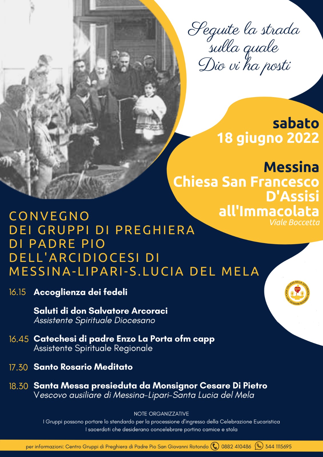 Sabato 18 giugno 2022 nella Chiesa di San Francesco d’Assisi all’Immacolata, viale Boccetta Messina, si svolgerà il Convegno diocesano dei Gruppi di preghiera di Padre Pio con il seguente programma: