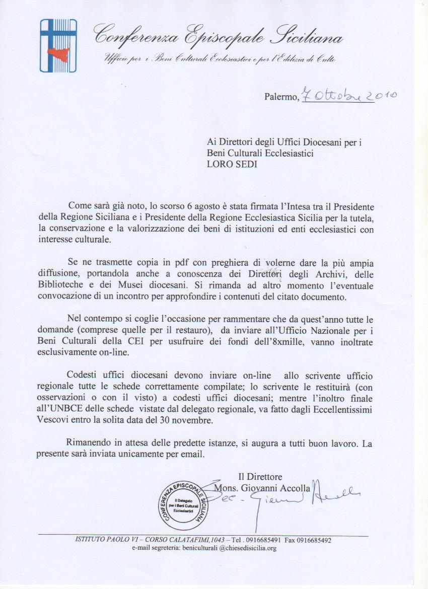 Documenti Lettera Mons. Giovanni Accolla 7 ottobre 2010Download Intesa tra Presidente Regione Siciliana e Presidente Regione Ecclesiastica Sicilia – per i Beni Culturali – 6 agosto 2010Download