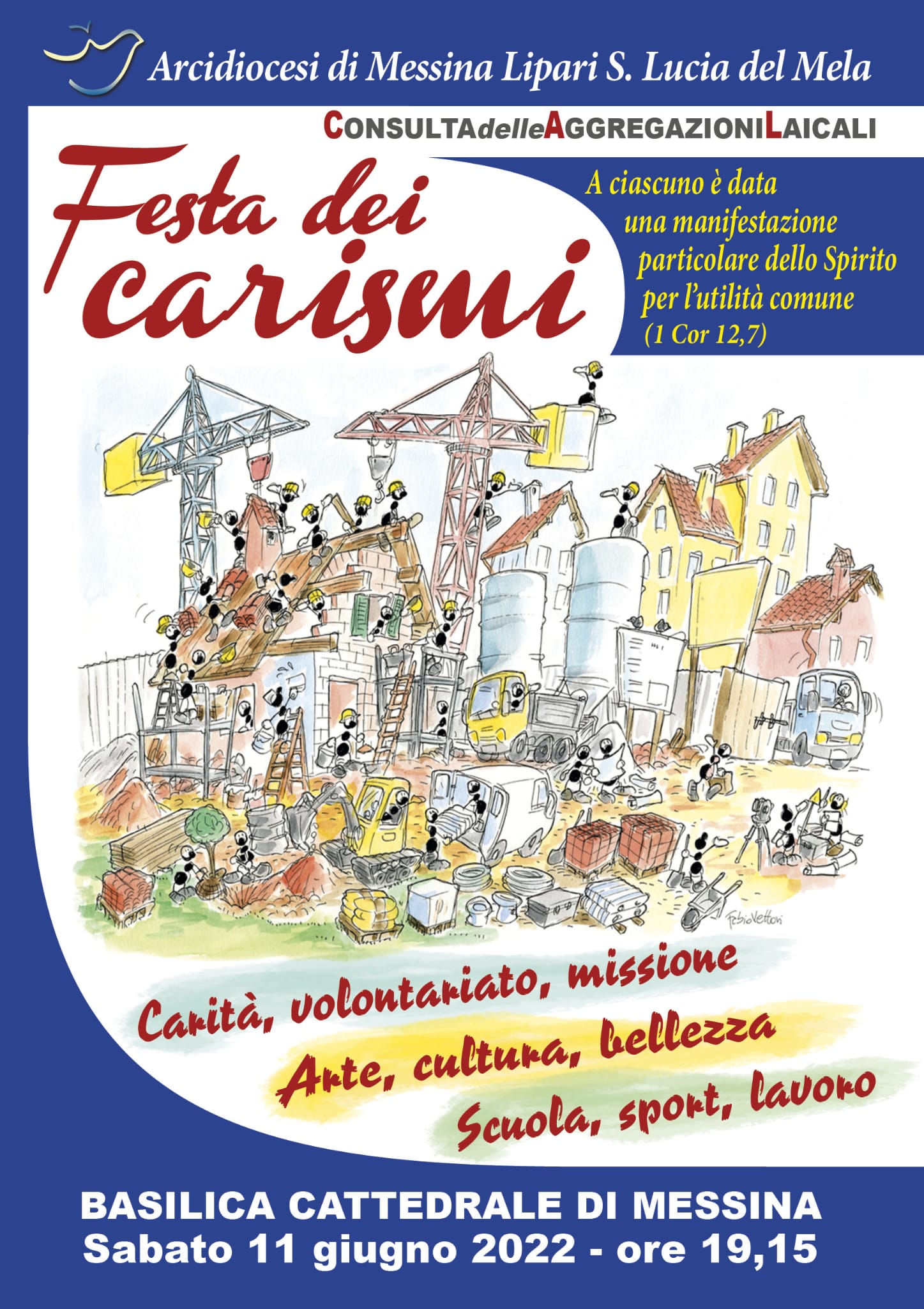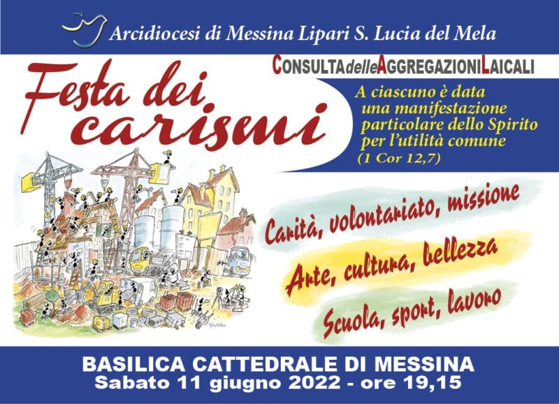 I cantieri di lavoro ci chiamano per stimolare la creatività, per fare crescere la sensibilità e il livello etico della comunità civile, per sollecitare l’intervento pubblico. Ognuno col suo carisma per costruire una città migliore. Non sarà solo la festa delle aggregazioni laicali ma una festa per tutti quelli che hanno a cuore Messina!!!