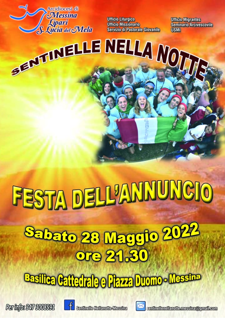 Sabato 28 maggio, alle ore 21.30, presso la Basilica Cattedrale e successivamente a piazza Duomo – Messina, nell’ambito del progetto pastorale “Sentinelle nella notte” e in prossimità della solennità della Madonna della Lettera, l’Ufficio Liturgico, l’Ufficio Migrantes, l’Ufficio Missionario, la Pastorale Giovanile, il Seminario Arcivescovile e l’USMI propongono la Festa dell’Annuncio, evento che tende a coinvolgere parrocchie, movimenti, associazioni e istituti religiosi per vivere un’esperienza forte di preghiera ed evangelizzazione nel cuore della nostra città, con canti e testimonianze.