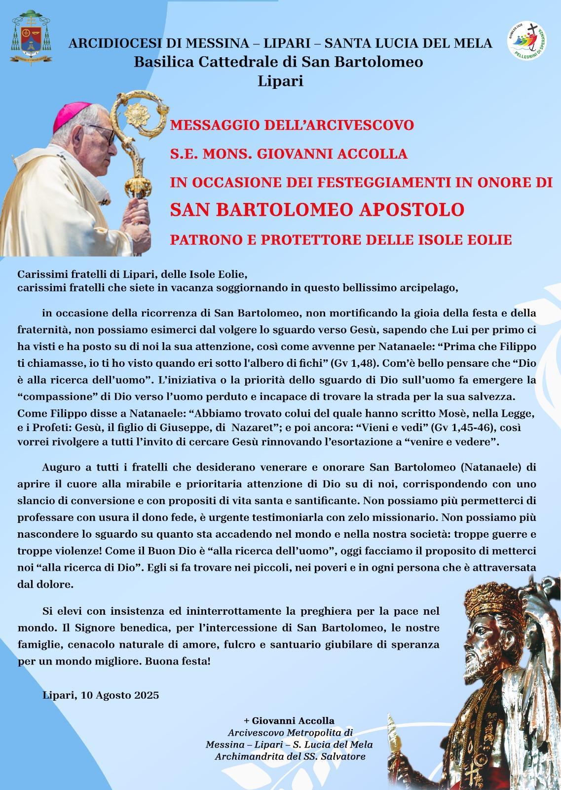Nel suo messaggio, l’arcivescovo Giovanni Accolla invita a volgere lo sguardo su Cristo Gesù, affinché – come avvenne per Bartolomeo – la vita di ciascuno percorra un cammino di costante conversione e maturi “propositi di vita Santa e santificante”.