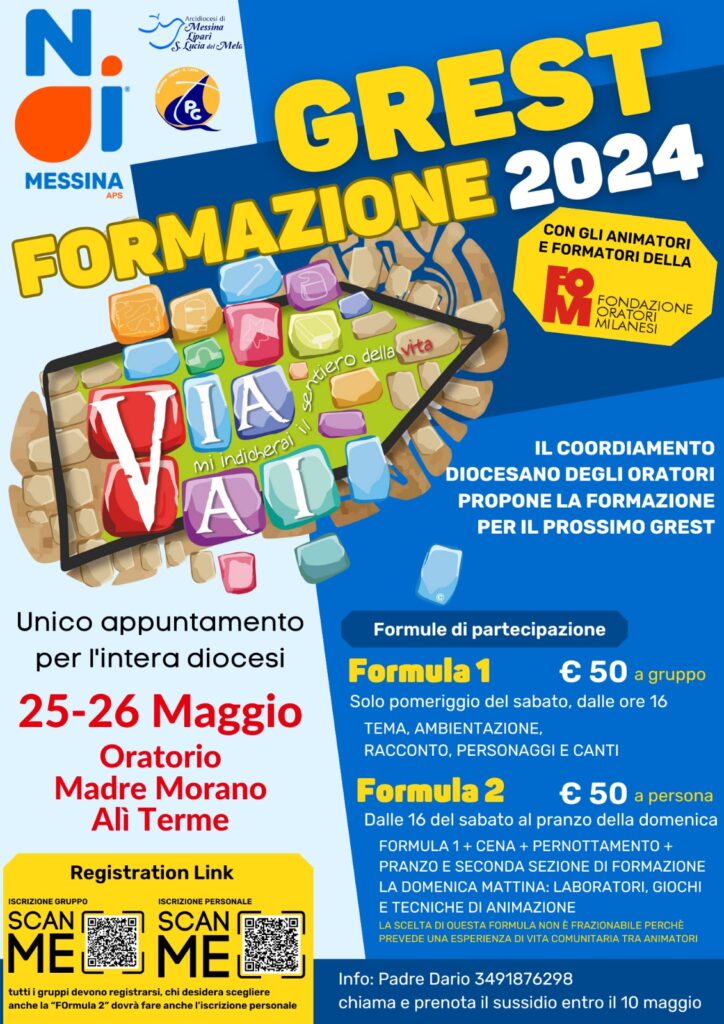 Si specifica che tutti i gruppi devono procedere con l’iscrizione (specificando parrocchia, oratorio o istituto religioso) al link. Gli animatori che intendono aderire alla formazione completa dovranno fare l’iscrizione personale al seguente link. Potete acquistare il sussidio online alla pagina oppure prenotarlo entro il 10 maggio chiamando il 349.1876298, lo ritirerete il giorno della formazione. Il Raduno Diocesano dei Grest si svolgerà a Giardini Naxos (ME) presso il Lido di Naxos Venerdì 5 Luglio, le informazioni verranno comunicate prossimamente.