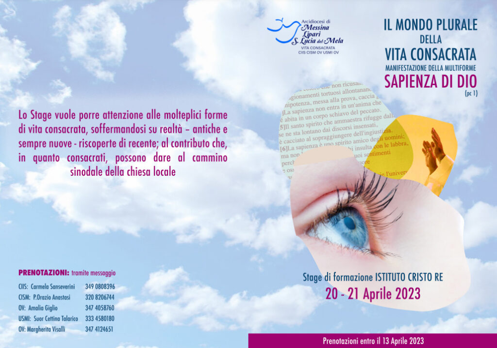 Si tratta di un appuntamento annuale, nel periodo pasquale, che si propone alla Chiesa locale come formazione ed aggiornamento delle tematiche storiche, teologiche, spirituali, ecclesiali e sociali della Vita Consacrata. L’appuntamento di quest’anno vuole porre attenzione alle molteplici forme di vita consacrata, soffermandosi su realtà – antiche e sempre nuove – riscoperte di recente; al contributo che, in quanto consacrati, possono dare al cammino sinodale della chiesa locale.