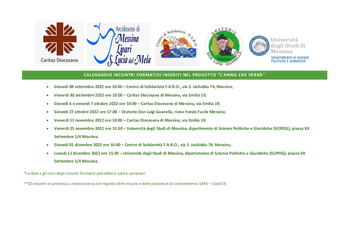 Gli incontri presso l’Oratorio Don Guanella, il Dipartimento SCIPOG dell’Università degli Studi di Messina e l’incontro sul bando “Resto al Sud” saranno curati dai volontari e/o operatori di appartenenza.