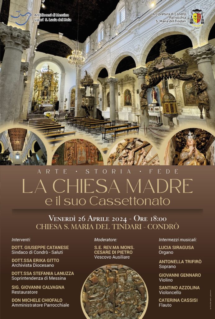 Dopo la riapertura al culto della chiesa madre lo scorso 19 marzo con la celebrazione Eucaristica presieduta dall’arcivescovo Giovanni Accolla, venerdì 26 aprile alle ore 18.00 un altro evento di spessore artistico, storico e religioso si terrà a Condrò dal tema “La chiesa madre e il suo cassettonato”, conferenza attraverso cui i relatori si muoveranno lungo il sentiero dell’arte, della fede del popolo e della sua storia. Modererà la conferenza il vescovo ausiliare Cesare Di Pietro.
