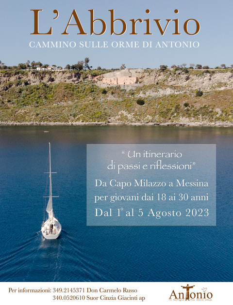 Quest’anno, nella nostra Arcidiocesi, viene proposto ai giovani dai 18 ai 30 anni, in sintonia con la Gionata mondiale della Gioventù di Lisbona, l’esperienza di un cammino (pellegrinaggio) sulle orme di S. Antonio, in quattro tappe da Capo Milazzo a Messina, dalla sera dell’1° al pomeriggio del 5 agosto 2023, dal significativo titolo “L’Abbrivio” (l’impulso iniziale con cui si dà moto o si aumenta gradualmente la velocità di una imbarcazione).