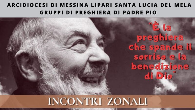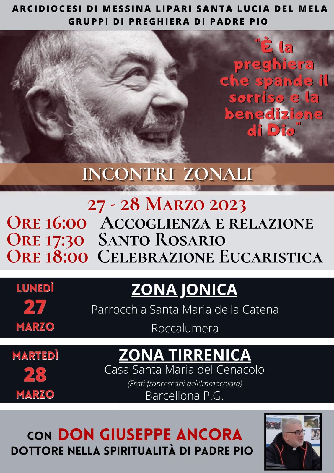 Il Coordinamento diocesano dei Gruppi di preghiera di Padre Pio, guidato d’assistente don Salvatore Arcoraci, ha organizzato due incontri di spiritualità con la partecipazione di don Giuseppe Ancora, presbitero dell’arcidiocesi di Taranto. Per la zona jonica l’incontro si svolgerà, lunedì 27 marzo alle ore 16.00, presso la Parrocchia Santa Maria della Catena di Roccalumera; per la zona tirrenica, martedì 28 marzo, alla Casa Santa Maria del Cenacolo (Frati francescani dell’Immacolata) di Barcellona P.G. allo stesso orario (consulta la locandina in jpg).
