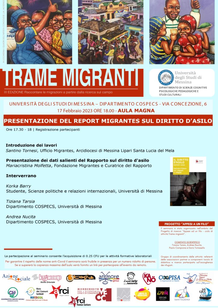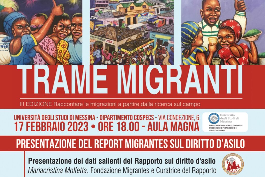 Venerdì 17 febbraio, alle ore 18.00, presso l’Aula magna del Dipartimento Cospecs (via Concezione, 6 – Messina), verrà affrontato il tema delle migrazioni forzate a partire dal Report sul diritto d’Asilo della Fondazione Migrantes, organismo pastorale della Conferenza Episcopale Italiana. Un lavoro realizzato da un’équipe di autrici ed autori che si lasciano “toccare e interrogare” dalle sofferenze e dalle contraddizioni che le persone in fuga nel mondo raccontano o portano scritte nei loro volti e nei loro corpi. Sarà presente Mariacristina Molfetta, antropologa culturale e co-curatrice del Report, che illustrerà i dati salienti consegnati dalla sesta edizione del volume.
