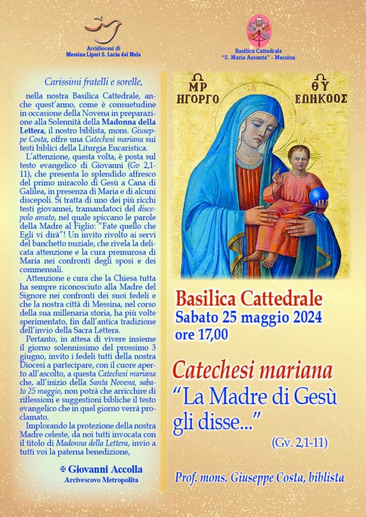 Alle ore 17.00 in Cattedrale, mons. Giuseppe Costa, canonico della Cattedrale e ordinario di Sacra Scrittura, terrà la catechesi mariana dal tema: “La Madre di Gesù gli disse…” (Gv 2,1-11).