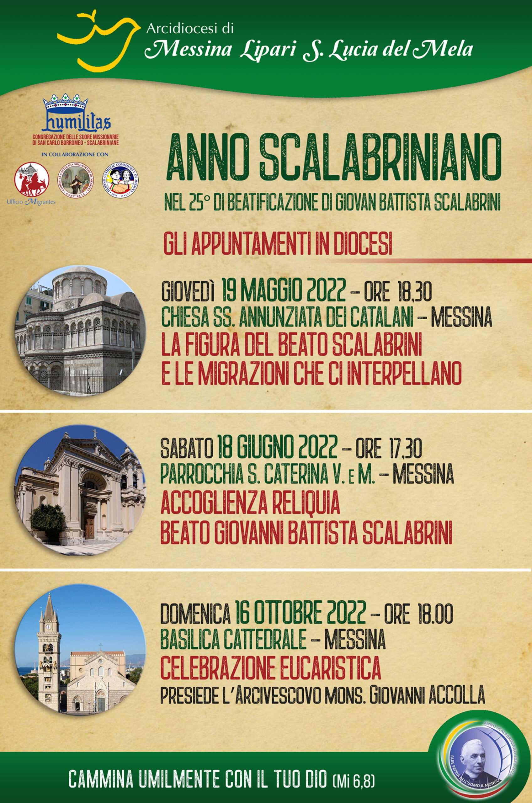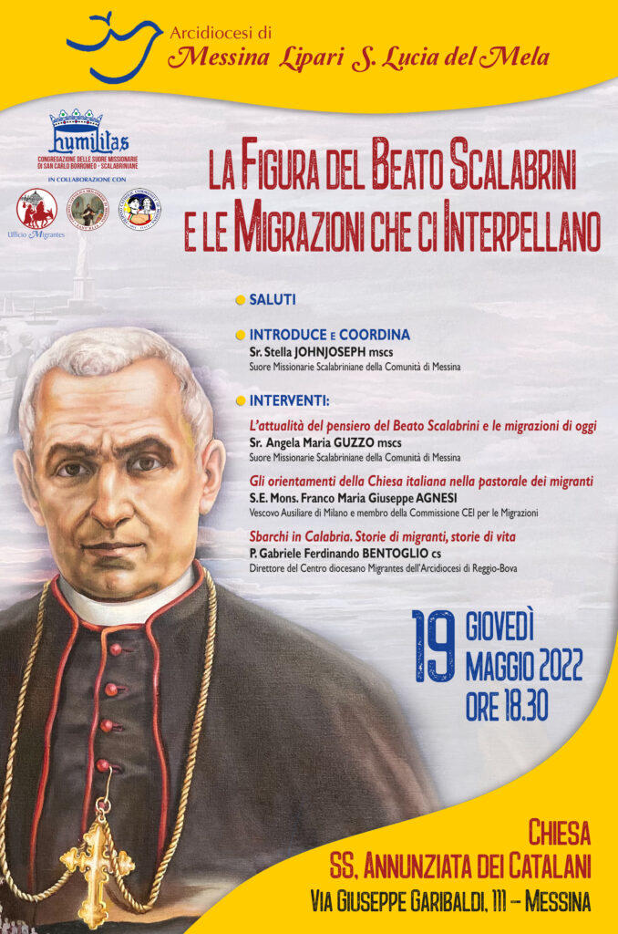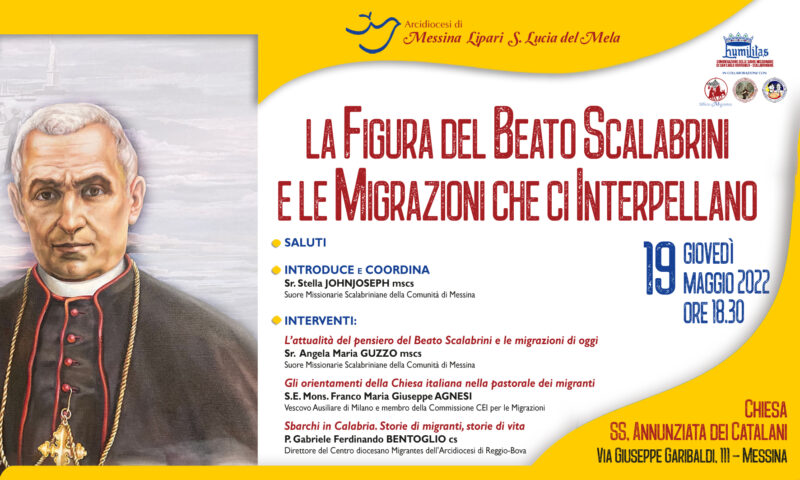 Il primo appuntamento è previsto giovedì 19 maggio 2022, alle ore 18.30, presso la Chiesa SS. Annunziata dei Catalani (via Garibaldi, 111 – Messina). Un seminario dal titolo “La figura del Beato Scalabrini e le migrazioni che ci interpellano”. Dopo i saluti dell’Arcivescovo mons. Giovanni Accolla, ci aiuteranno a riflettere sul tema sr. Angela Maria Guzzo mscs, Comunità delle Suore Missionarie Scalabriniane di Messina; S. E. mons. Franco Maria Giuseppe Agnesi, Vescovo ausiliare di Milano e membro della Commissione CEI per le Migrazioni; p. Gabriele Ferdinando Bentoglio cs, direttore del Centro diocesano Migrantes dell’Arcidiocesi di Reggio-Bova.