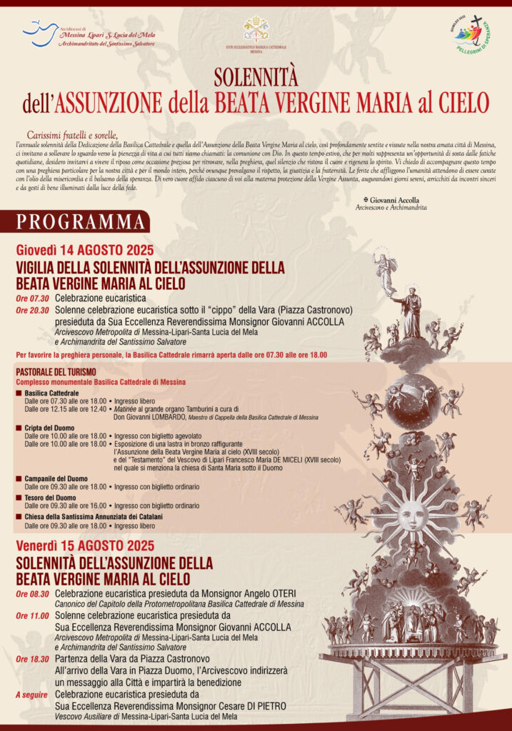 - GIOVEDÌ 14 AGOSTO, vigilia della solennità dell’Assunzione della B.V.M. al Cielo, l’arcivescovo mons. Giovanni Accolla alle ore 20.30 presiederà l’Eucaristia ai piedi della Vara, a Piazza Castronovo.