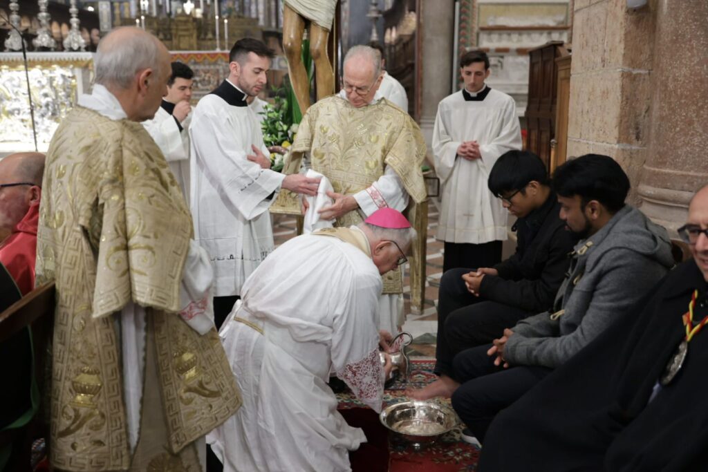 Di grande forza i segni della liturgia del giovedì santo. Tra tutti, l’arcivescovo ha voluto cogliere quello della lavanda dei piedi, quale espressione della partecipazione della vita dell’uomo alla vita di Cristo, che “passa attraverso il servizio e insegna ad amare come Gesù ha amato”. Nella eloquenza di questo gesto “Gesù sconvolge e scandalizza. Il Signore lava via dai piedi dei discepoli il sudore e la sporcizia della vita quotidiana”. Il suo chinarsi esprime la sua identità: l’umiltà. Continua l’arcivescovo dicendo che Cristo Gesù “ci ha purificato dal puzzo della nostra superbia e dalla sporcizia del nostro egoismo, rendendoci capaci di accedere al convito dell’amore di Dio”.