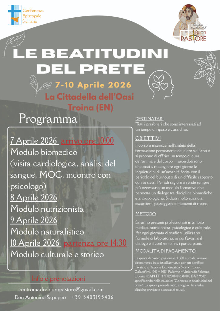 dalle parrocchieLe Beatitudini del prete Iniziativa promossa dal Centro Madre del Buon Pastore per i presbiteri che si terrà presso la Cittadella dell’Oasi a Troina nei giorni 7-10 aprile prossimi. Nella locandina si possono acquisire tutte le informazioni necessarie per partecipare. condividi su 17 Marzo 2026