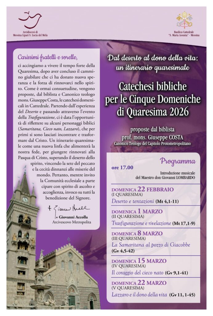 La Quaresima – tempo forte di ascolto della Parola, di preghiera e di conversione – è accompagnato da anni nella nostra Chiesa diocesana dalle catechesi quaresimali tenute nella Basilica Cattedrale dal biblista e canonico teologo del Capitolo Protometropolitano, prof. Mons. Giuseppe Costa.
