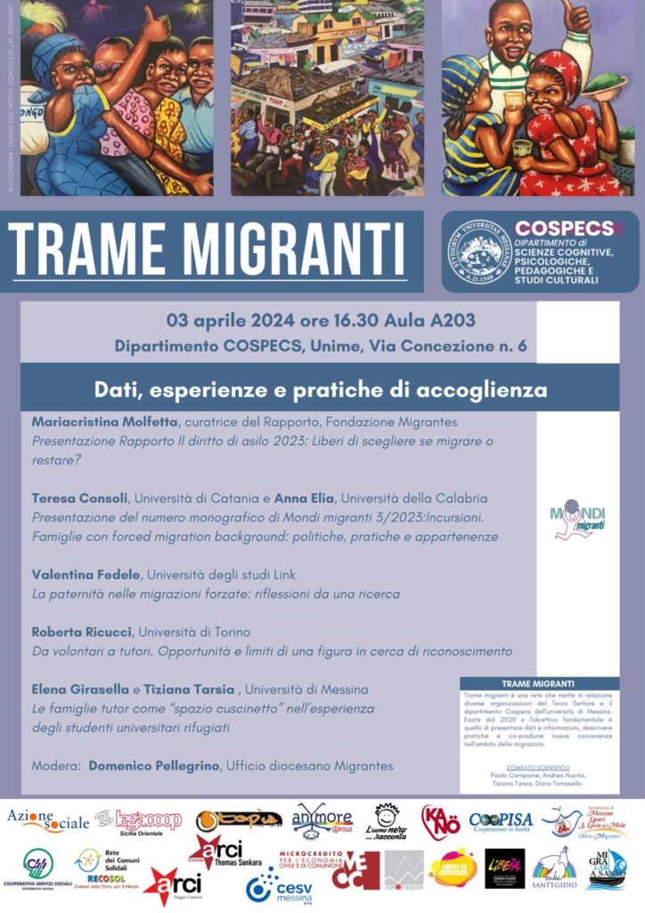 La rete “Trame migranti”, composta dal Dipartimento Cospecs-UniMe e da associazioni che sul territorio lavorano con le persone coinvolte nella mobilità umana, mercoledì 3 aprile, alle ore 16.30, presso l’Aula A203 del Dipartimento Cospecs (via Concezione, 6 – Messina), promuove un Seminario in cui verrà affrontato il tema delle migrazioni forzate a partire dal Report sul diritto d’Asilo della Fondazione Migrantes, organismo pastorale della Conferenza Episcopale Italiana. Un lavoro realizzato da un’équipe di autrici ed autori che si lasciano “toccare e interrogare” dalle sofferenze e dalle contraddizioni che le persone in fuga nel mondo raccontano o portano scritte nei loro volti e nei loro corpi. Sarà presente Mariacristina MOLFETTA, antropologa culturale e co-curatrice del Report, che illustrerà i dati salienti consegnati dalla settima edizione del volume.