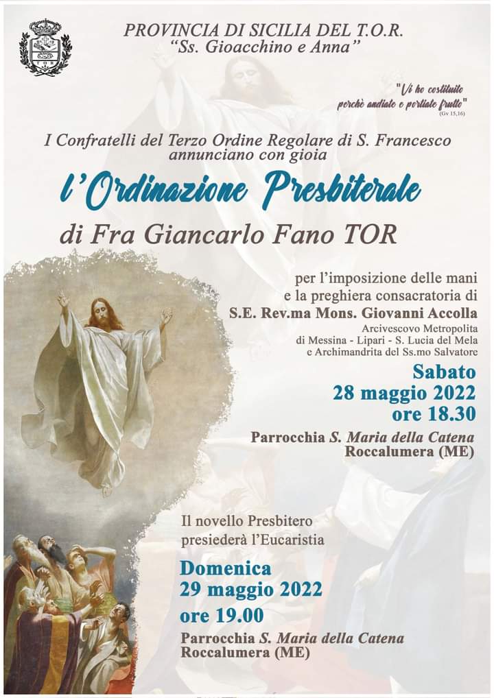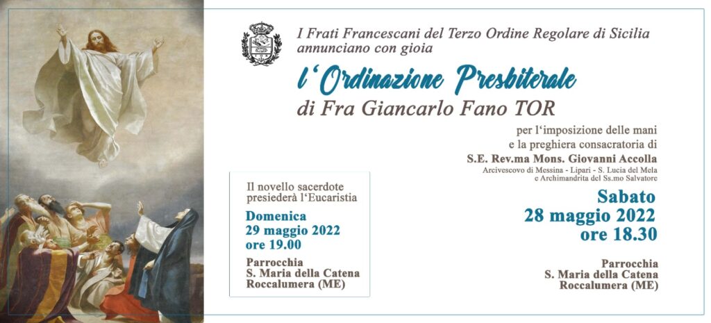 Sabato 28 maggio nella Parrocchia di S. Maria della Catena in Roccalumera l’Arcivescovo Mons. Giovanni Accolla ordinerà presbitero P. Giancarlo Fano, francescano del Terzo Ordine Regolare, oriundo di Roccalumera.